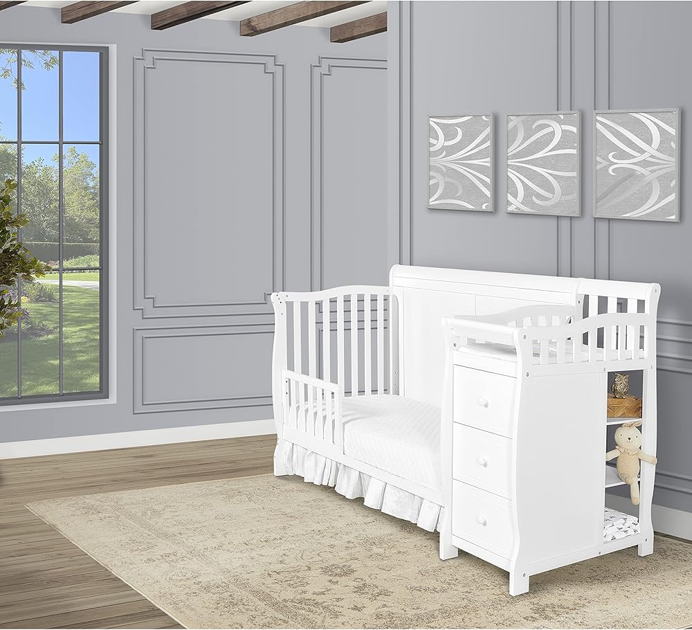 CONVENIENTLY DESIGNED: This mini crib comes packed with all necessary assembly tools, 3-level mattress support, and a detachable changing table with a 1-inch-thick changing pad. NOTE: The changing table can be used as a standalone piece only in full-size bed conversion mode.