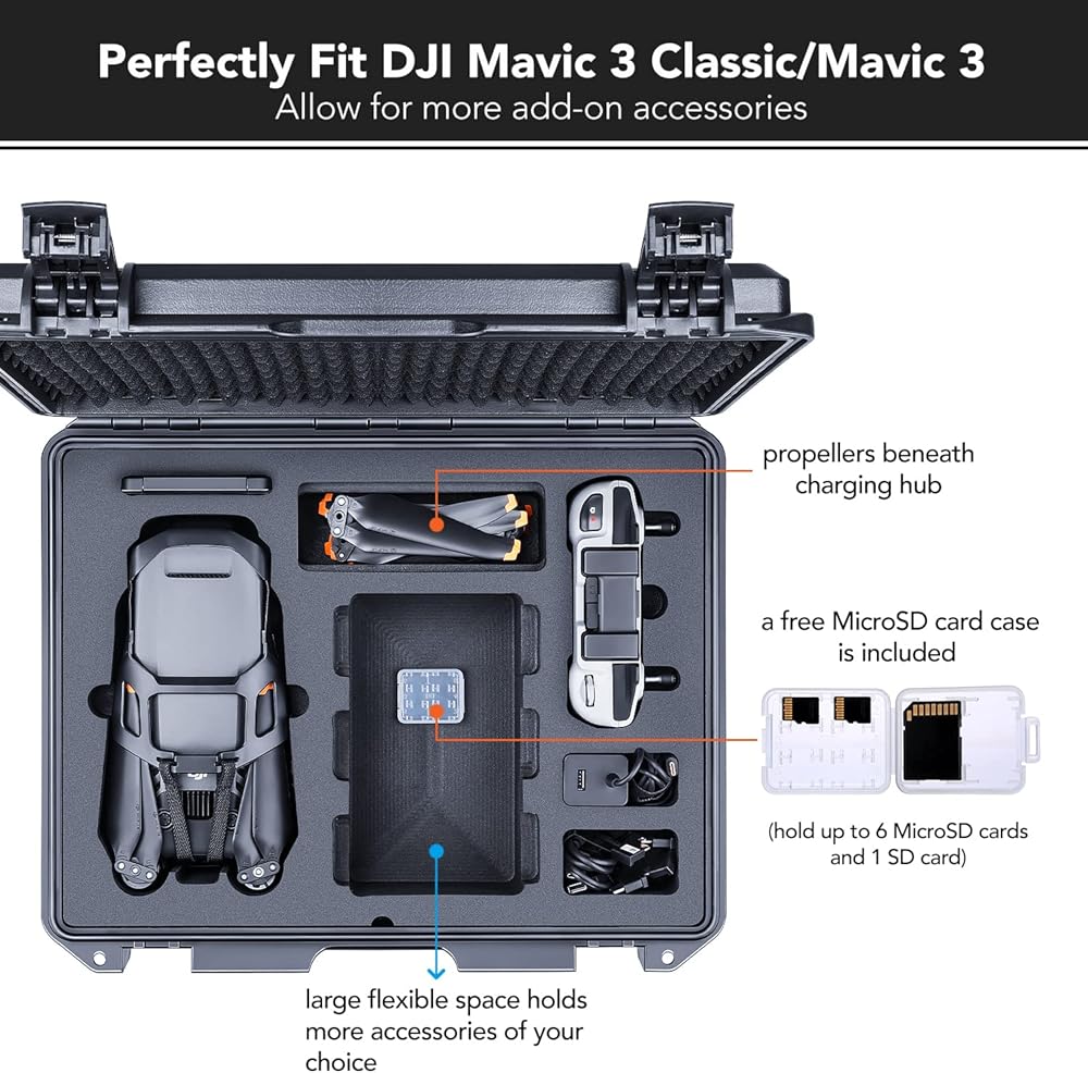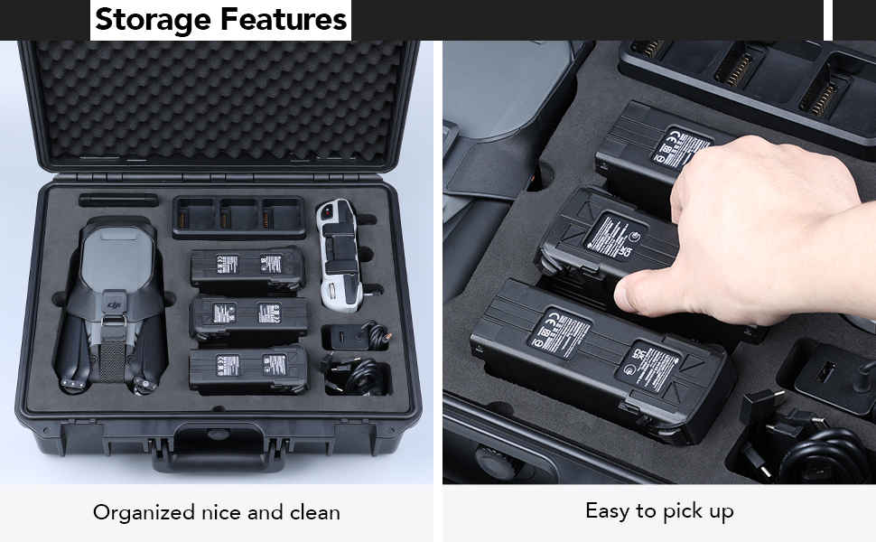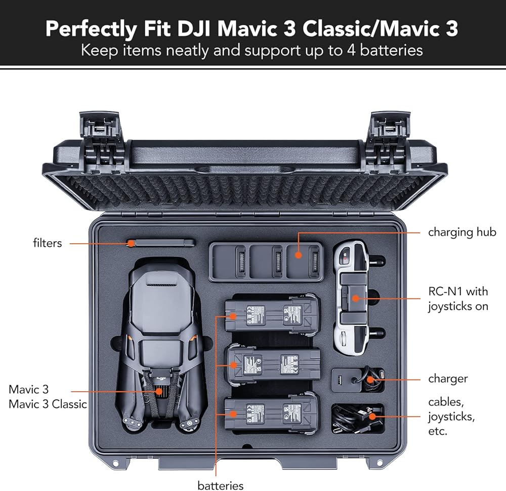 التخزين - يناسب DJI Mavic 3 Classic، وحدة تحكم RC-N1، 4 بطاريات، شاحن، كابلات، فلاتر والمزيد من الملحقات. تتوفر مساحة مرنة كبيرة للملحقات الإضافية.