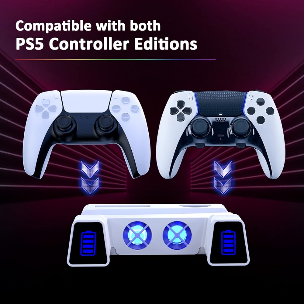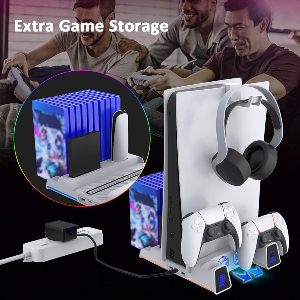 حامل تبريد NexiGo PS5 مع ضوء RGB LED ومحطة شحن مزدوجة متوافقة مع وحدة تحكم DualSense Edge وفتحة القرص الصلب وسماعات الرأس وحاملات جهاز التحكم عن بعد و10 فتحات ألعاب، أبيض