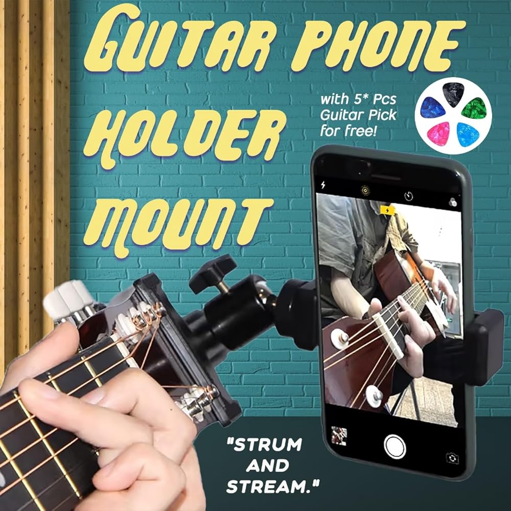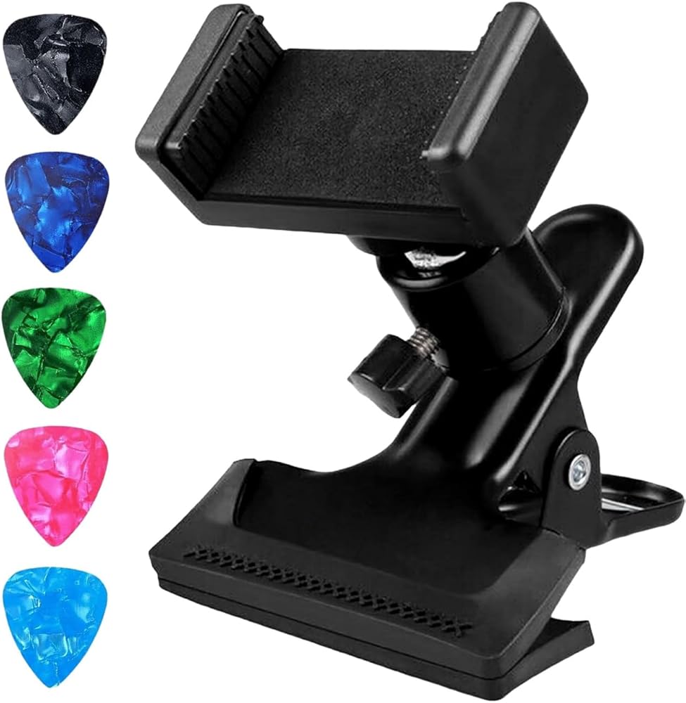 This Guitar Phone Holder Mount with 5 guitar picks is the perfect addition to any guitarist's setup, offering a secure and convenient way to keep your phone within reach while you play. This phone holder for guitar attaches easily to your instrument, allowing you to access tabs, chord charts, or apps without interrupting your playing.