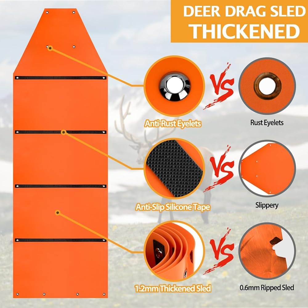 • شديدة التحمل ومقاومة للتمزق: شديدة التحمل ومقاومة للتمزق: مصنوعة من البولي إيثيلين المتين مع مادة معززة ومقاومة للتمزق، وقد تم تصميم هذه الزلاجة لحمل غزال كبير موسمًا بعد موسم. شرائط مضادة للانزلاق وحبال نايلون قوية تعزز الثبات