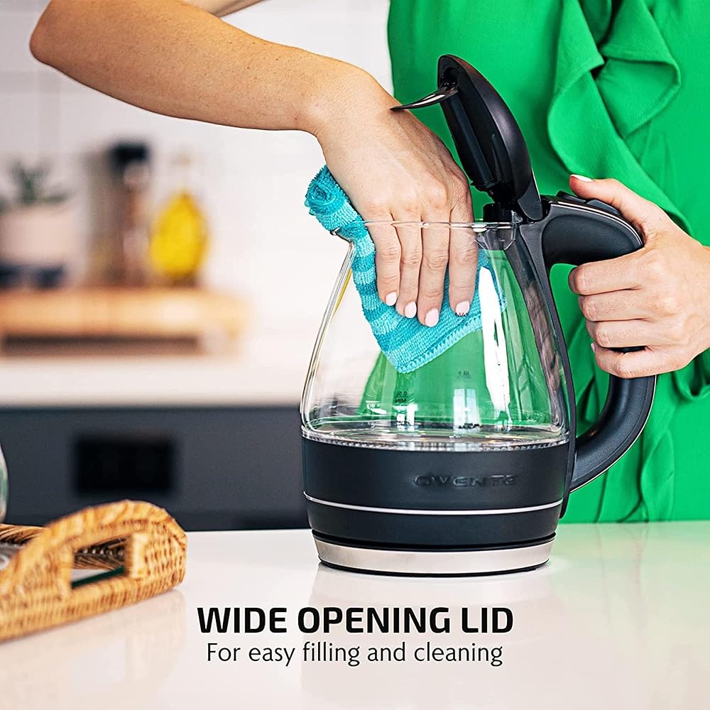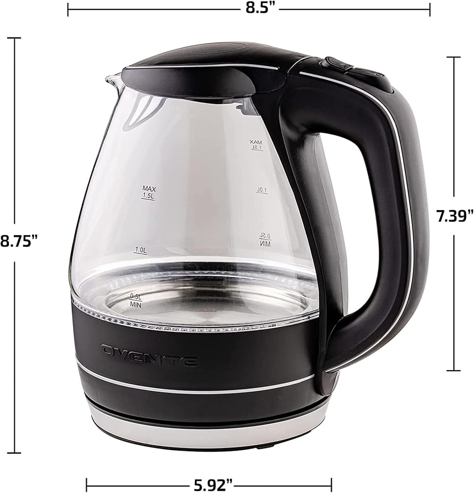 غلاية مياه كهربائية زجاجية من OVENTE سعة 1.5 لتر من زجاج البورسليكات وسخان سطح الطاولة سريع الغليان - غلاية تسخين مياه فورية خالية من مادة BPA لصانع القهوة والشاي - أسود KG83B
