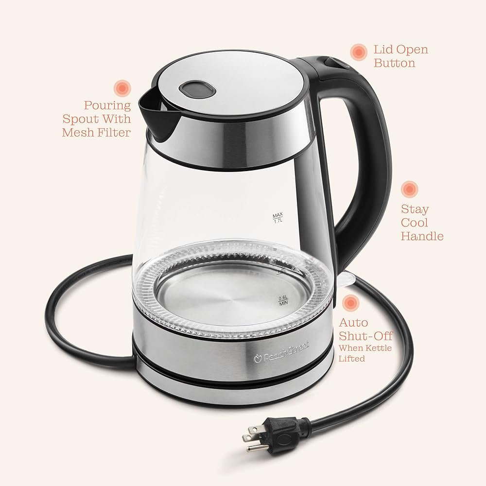 غلاية كهربائية سبيد بويل للقهوة والشاي - غلاية مياه سعة 1.7 لتر بقدرة 1500 وات، زجاج بوروسيليكات، فتحة واسعة سهلة التنظيف، إيقاف تلقائي، مقبض بارد يعمل باللمس، إضاءة LED. دوران 360 درجة، حماية من الغليان الجاف