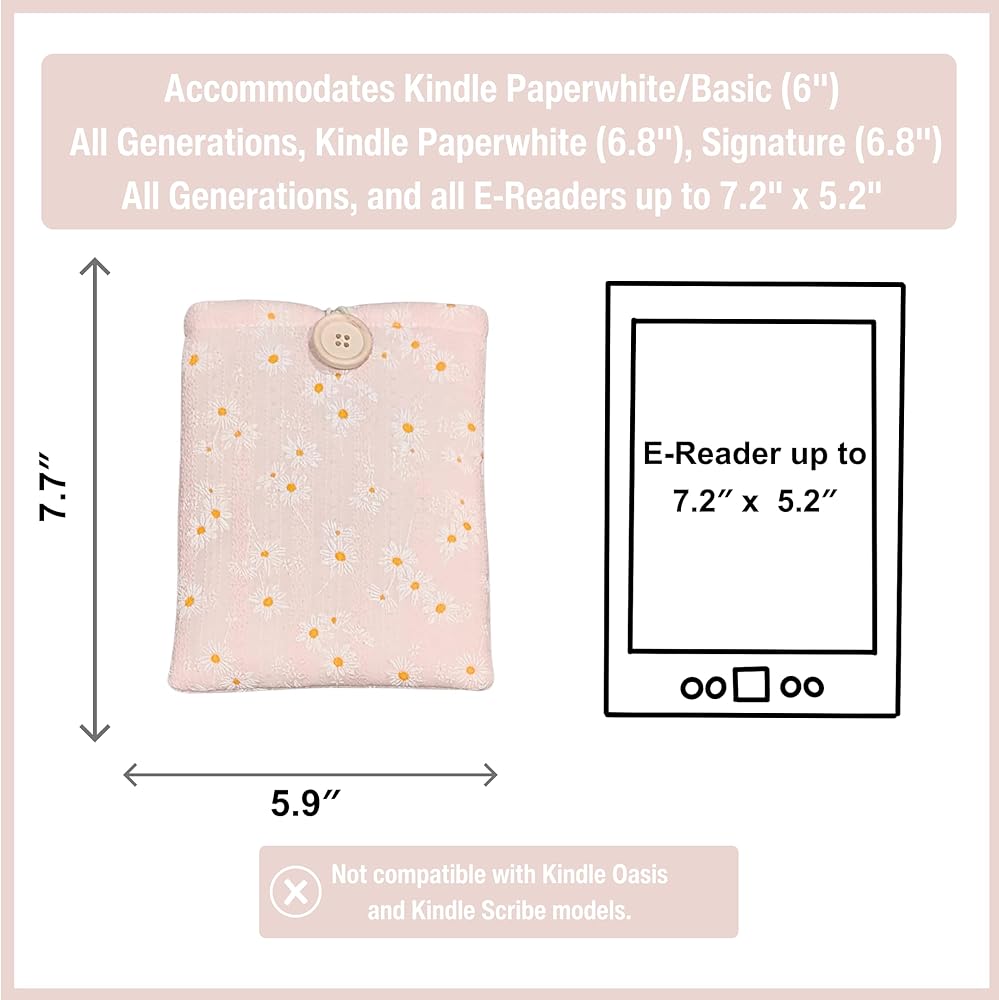 Zosiana Designs Kindle E-Reader Sleeve Main Features Beautiful floral design that adds a touch of elegance and style to your e-reader. Handmade with meticulous attention to detail, ensuring each sleeve is unique and of the highest quality. Includes cotton padding and soft lining to protect your device from scratches and impacts. Secured with a wooden button and elastic closure for easy access and added protection. Compatibility The sleeve measures 19.5x15 cm and is compatible with the following Kindle and Kobo models: Kindle (4th Generation, 2011), Kindle (5th Generation, 2012), Kindle Paperwhite (1st Generation, 2012), Kindle Paperwhite (2nd Generation, 2013), Kindle (7th Generation, 2014), Kindle Voyage (2014), Kindle Paperwhite (3rd Generation, 2015), Kindle (8th Generation, 2016), Kindle Paperwhite (4th Generation, 2018), Kindle (10th Generation, 2019), Kindle Paperwhite (5th Generation, 2021), Kobo Clara HD, Kobo Nia. Note: This sleeve is not compatible with Kindle Oasis and Kindle Scribe. External Dimensions 19.5x15 cm (7.68x5.91 inches)