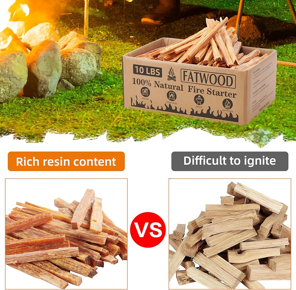 غني بالراتنج: خشب الدهون هو مادة طبيعية تمامًا لإشعال النار مصدرها أشجار الصنوبر. ما يميزه هو محتواه العالي من الراتنج، مما يجعله أداة إشعال نار استثنائية.