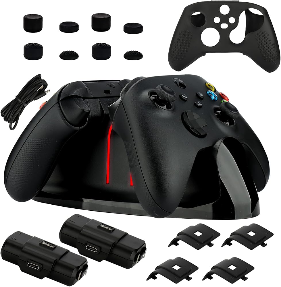 • 【Dual Controller Charger Kit Includes】 1*Dual Charging Dock, 2*Rechargeable Battery, 4*Battery Covers( includes 2 battery covers for Xbox One, One x, One S Elite, and another 2 for Xbox Series X/S), 1*Charging Cord, 8*Thumb Grip Caps, 1*Controller Silicone Skin. ( NOTE: The Controller Silicone Skin only fit for Xbox Series X|S, but the other accessories are compatible with Xbox Series X/S One/One X/One S Elite )