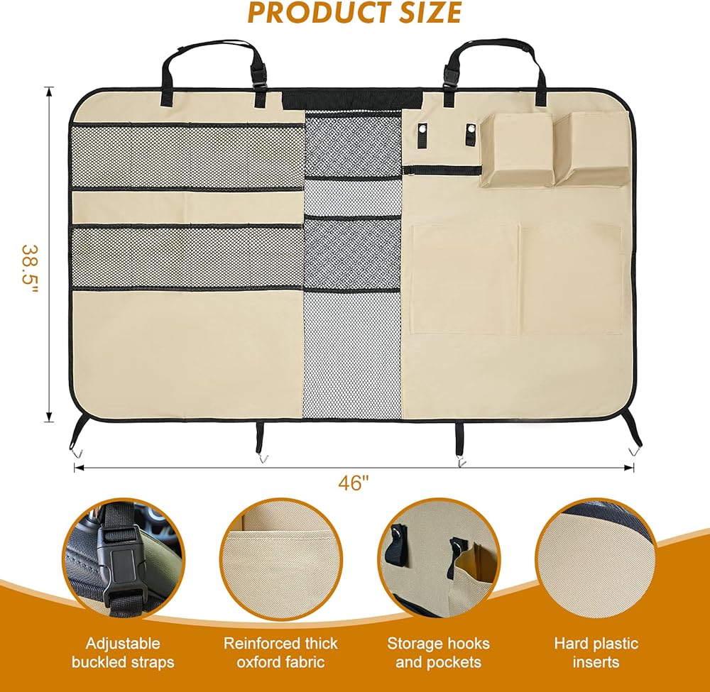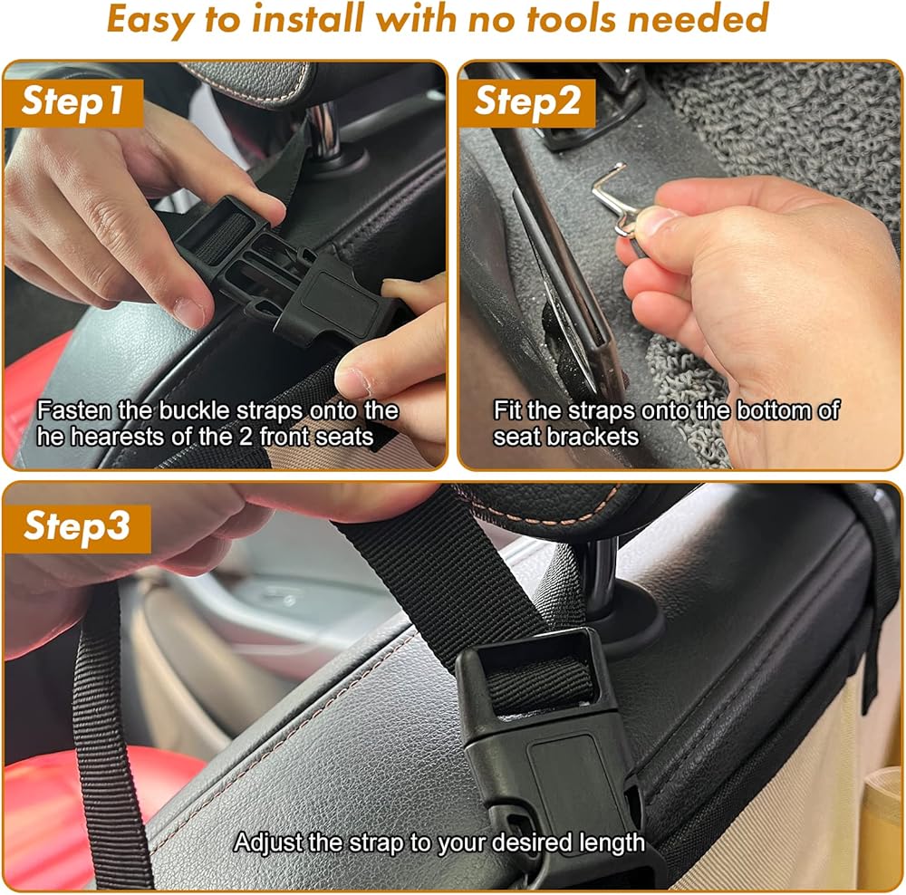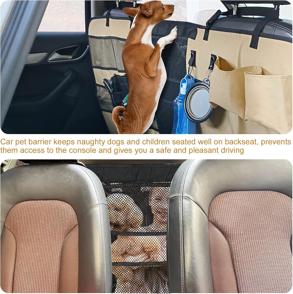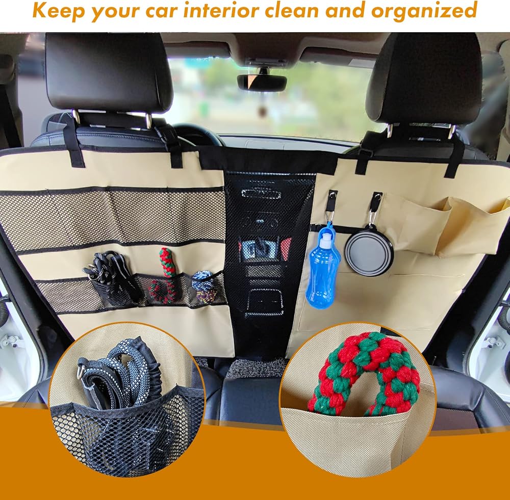 Car Space Saving: Designed with 2 fabric loops and multiple storage pockets, our dog barrier for suv is handy to hang travel dog bowls, purse, grocery bag, and hold water bottles, dog leash, treats or toys for kids and pets to keep car well organized.
