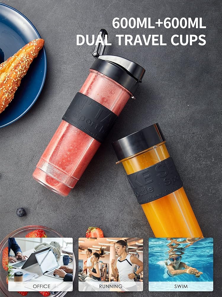 أثناء التنقل - خلاط يابانو الشخصي مع 2 × زجاجة سفر بسعة 20 أونصة و2 × غطاء سفر، يمكنك صنع مشروبك المفضل ومشروبك الرياضي ثم أخذه وانطلق. ويمكن وضع كلتا الزجاجتين في حامل أكواب السيارة.