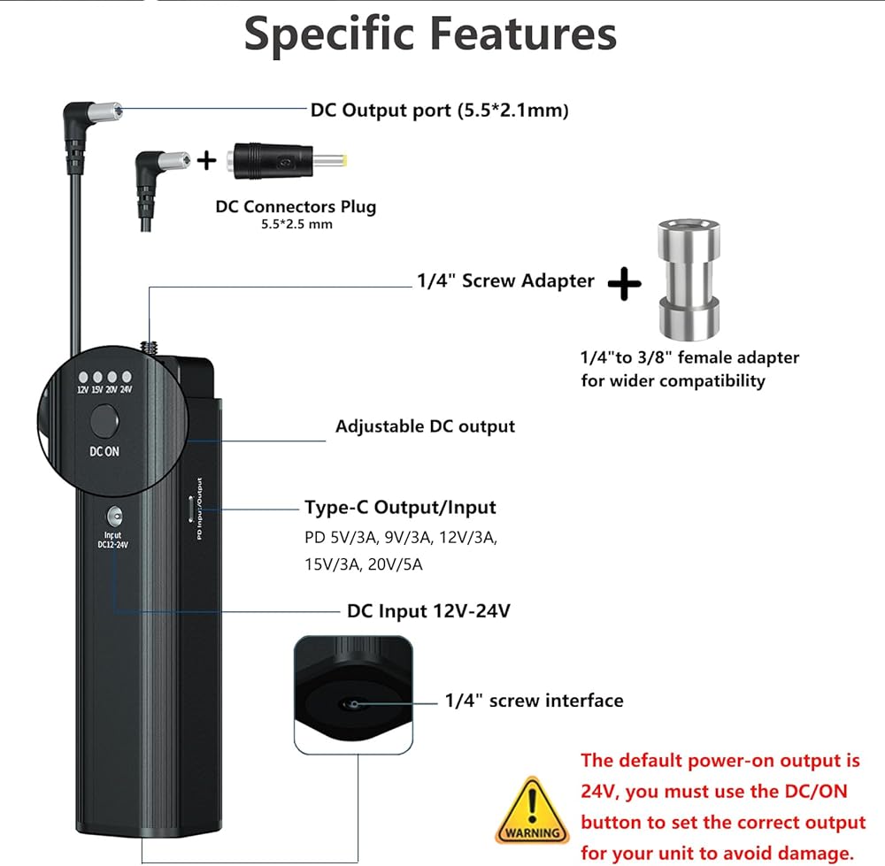 【تذكير لطيف】مخرج التشغيل الافتراضي هو 24 فولت، ويجب عليك استخدام زر التيار المستمر/التشغيل لضبط الإخراج الصحيح لجهازك قبل التوصيل، وإلا فقد يتعرض جهازك للتلف. (على سبيل المثال، إذا كان دخل جهازك هو 12 فولت، فيجب عليك ضبط خرج قبضة البطارية على 12 فولت.)
