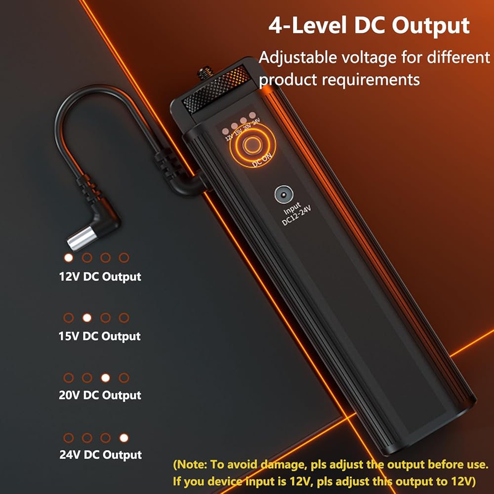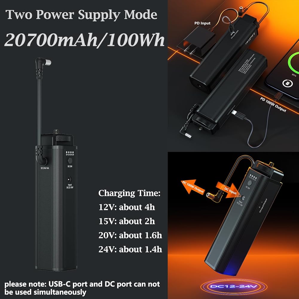 【شحن سريع ثنائي الاتجاه】يدعم مقبض طاقة البطارية إدخال تيار مستمر 12-24 فولت وإخراج 24 فولت/3 أمبير، ومدخل ومخرج USB-C PD 5 فولت/3 أمبير، 9 فولت/3 أمبير، 12 فولت/3 أمبير، 15 فولت/3 أمبير، 20 فولت/5 أمبير، أقصى قوة تصل إلى 100 واط. يعمل مع أي جهاز بقوة أقل من 100 وات، مثل مصابيح لوحة LED، وأضواء الفيديو COB، والإضاءة الخارجية، وكاميرات DSLR، وكاميرات الحركة Gopro، وحتى شحن الأجهزة اللوحية والهواتف الذكية والأجهزة المحمولة الأخرى أثناء رحلتك. (ملاحظة: سيحدث عدم توفر الطاقة للأجهزة التي تزيد طاقتها عن 100 واط)