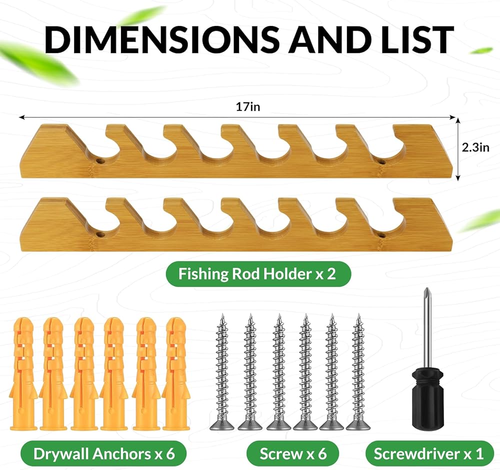 حامل صنارة الصيد الفاخر: يمكن تعديل المسافة بين حامل صنارة الصيد المثبت على الحائط ليناسب طول صنارة الصيد الخاصة بك. صينية حمل إضافية، سهلة التركيب وزيادة سعة الحمل. حامل صنارة الصيد مع 6 براغي توسيع سهل التركيب عموديًا. ملاحظة: عرض الأخدود هو 0.7 بوصة، يرجى التأكد من وضع صنارة الصيد أولاً، وضبط المسافة المحددة بين البراغي والمسامير، ثم قم بتثبيتها حتى يتم تثبيت صنارة الصيد بإحكام.