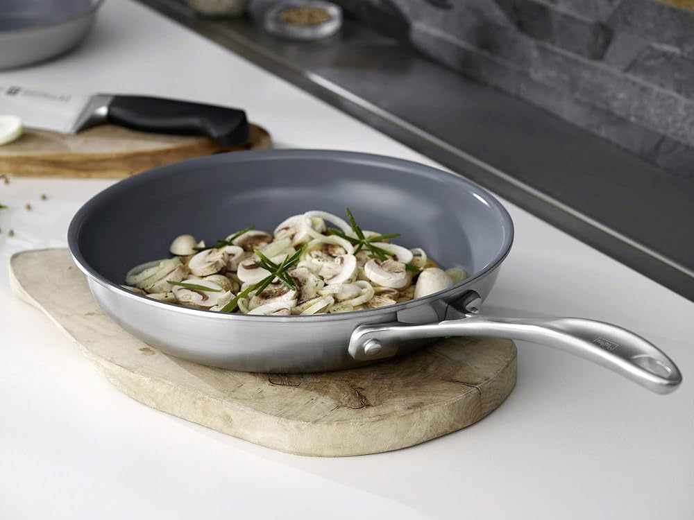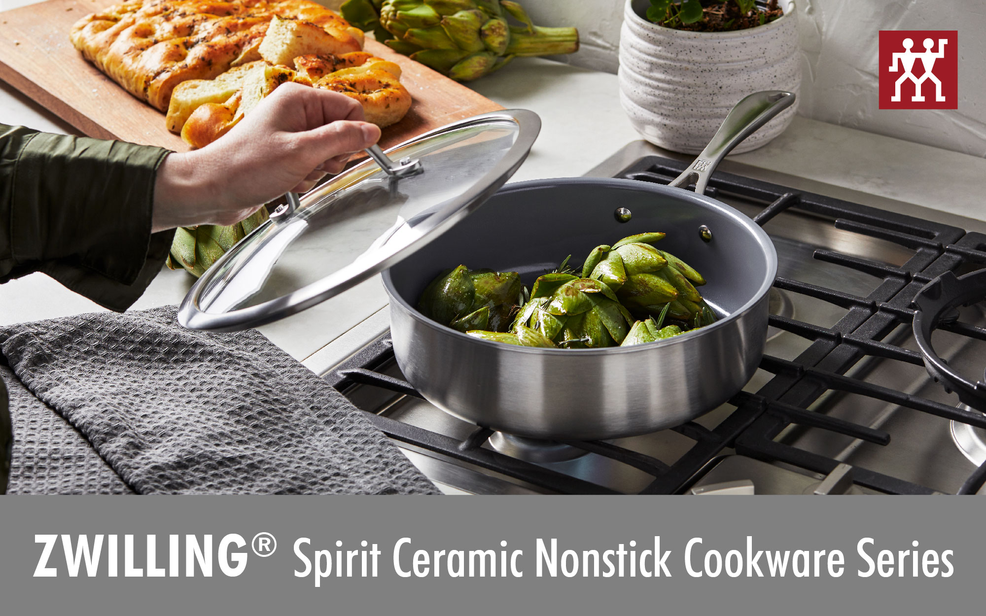 ZWILLING Spirit 3-Ply gets you in the mood to cook. Thanks to a thick, aluminum core, these versatile pans are fast-heating and boast an even cooking surface. The exclusive, stay cool handles are designed for easy maneuvering with oven mitts and the dripless pouring rims help prevent kitchen spills. The ZWILLING Spirit ceramic nonstick coating is a healthy alternative to traditional PTFE coatings. Less oil is required and no toxic fumes are released into the air when the pan is heated at high temperatures.