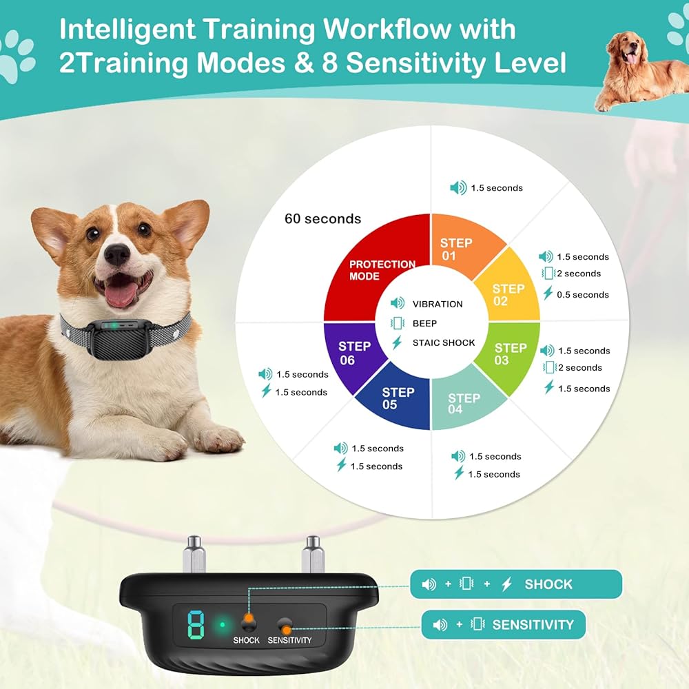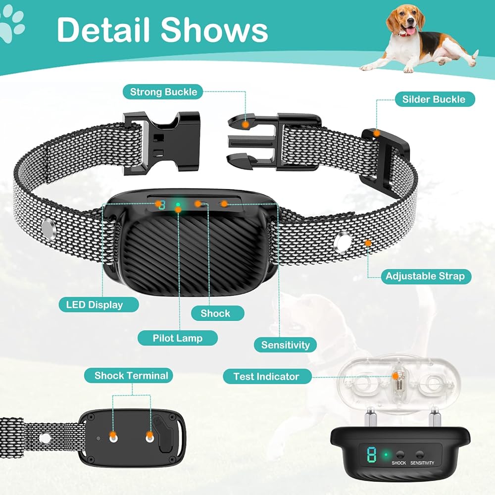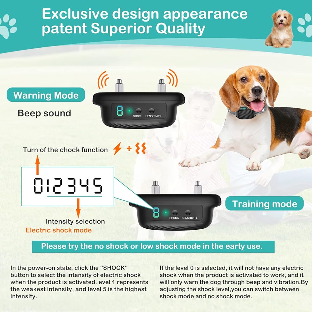 مساعد أكثر أمانًا لمكافحة النباح: يحتوي طوق النباح على وضعين للعمل، بدون وضع الصدمات: صفير + اهتزاز؛ وضع الصدمة: صفير + اهتزاز + صدمة، هناك 8 مستويات حساسية قابلة للتعديل، اضغط على زر الصدمة لتبديل الأوضاع حسب الرغبة. دع عائلتك وجيرانك يستمتعون ببيئة خالية من الضوضاء.