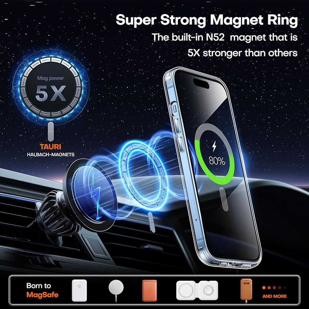 【Super Magnetic Properties】The built-in super N52 magnets can strengthen the magnetic connection and ensure auto-alignment to make wireless/ Mag-safe charging faster and safer than before. This Magnetic Case for iPhone 15 Plus is designed for all Qi-certified Mag-safe chargers, Mag-safe wallets, and car mounts