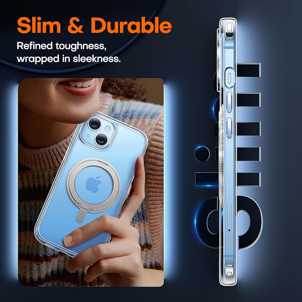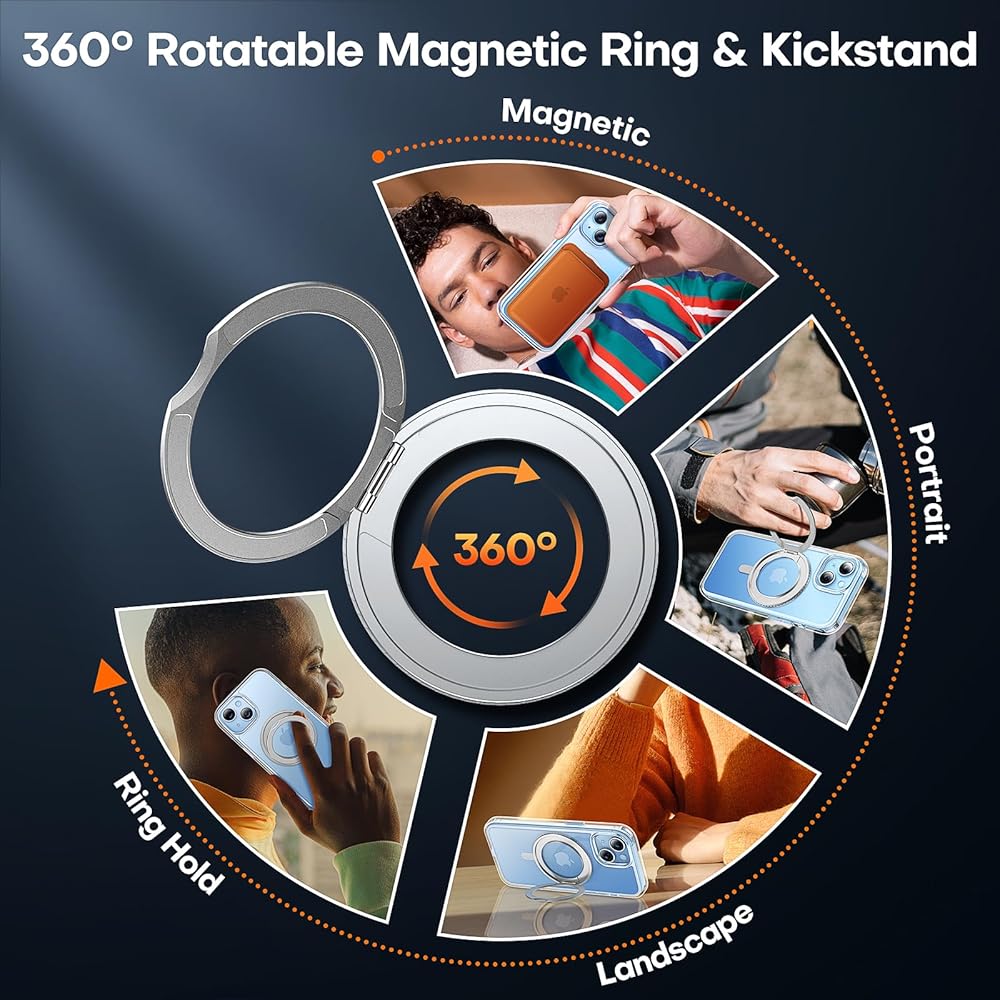 【360°Rotatable Ring Stand】When folded, the kickstand seamlessly aligns with the back of the case, maintaining a slim profile for easy pocket-sliding. Prop your phone up vertically or horizontally when learning, working, playing, or watching videos, etc. It also can double as a ring holder, great for securing your grip when taking selfies
