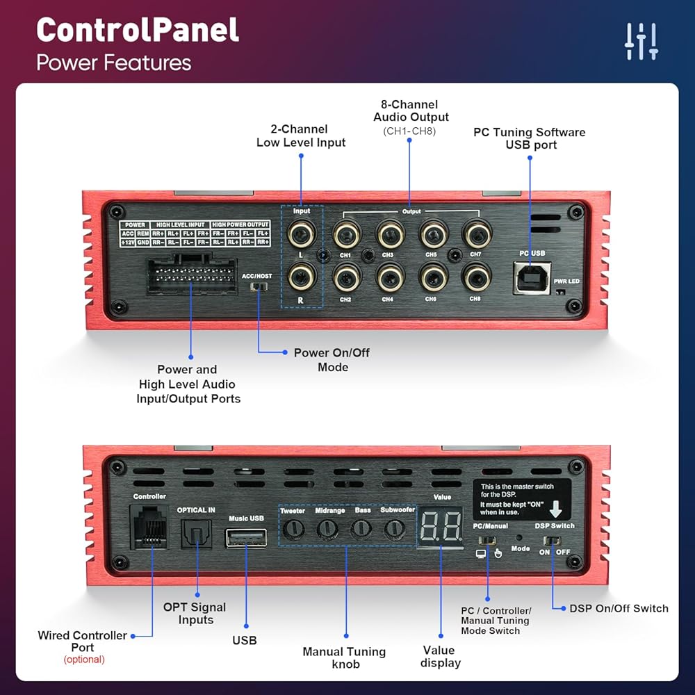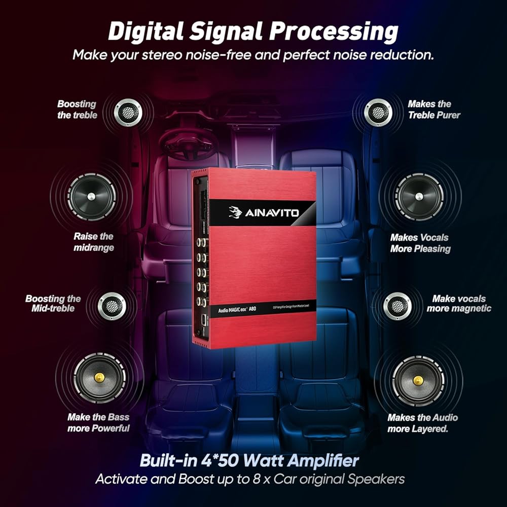 8 قنوات إدخال/إخراج الصوت DSP: يعمل مضخم صوت السيارة A80 DSP على تحسين نظام الصوت في سيارتك بشكل شامل. يدعم إخراج الصوت عالي المستوى 4 قنوات + مدخل صوت 4 قنوات، بالإضافة إلى إخراج 8 قنوات منخفض المستوى + مدخل منخفض المستوى (AUX) ثنائي القناة. وهو متوافق مع المزيد من مضيفي الصوت. سواء كان الأمر يتعلق بمكبرات صوت تصل إلى 4x أو مكبرات صوت فرعية تعمل بالطاقة، يمكن أن يكون A80 متوافقًا بسهولة ويمنحك تجربة جودة صوت ممتازة.