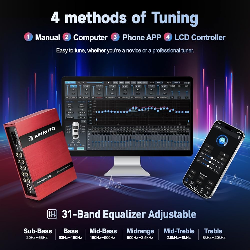 4 طرق ضبط: يحتوي معالج DSP للسيارة AINAVITO A80 على 4 أوضاع ضبط، دليل/برنامج كمبيوتر/تطبيق الهاتف/أوضاع تحكم LCD، صممها فريق من موالفات السيارات من كاليفورنيا والصين. إنه سهل التشغيل وله تأثيرات واضحة. سواء كنت موالفًا مبتدئًا أو محترفًا، يمكنك العثور بسرعة على طريقة الضبط التي تناسبك.