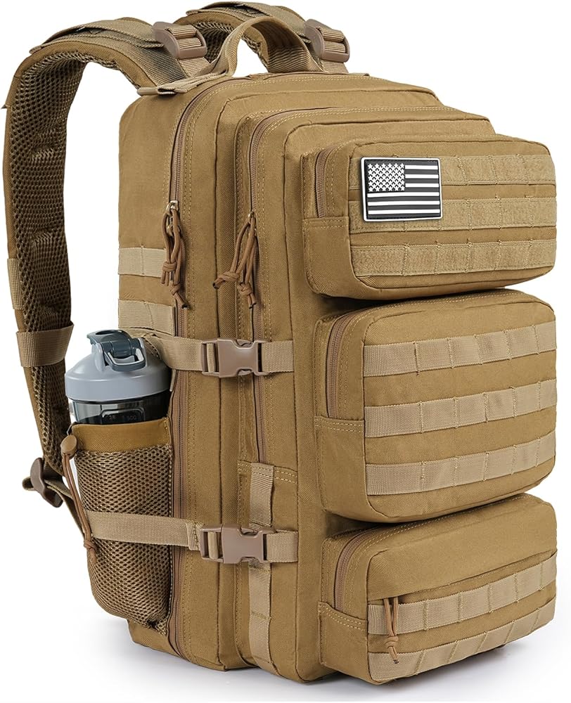 ميزات تكتيكية محسنة: تشتمل حقيبة الظهر molle على ميزات تكتيكية مثل المقابض المعززة ونقاط ربط الملحقات وأشرطة الضغط. يسمح نظام Molle بحقائب تكتيكية إضافية، ويمكنك إرفاق أي رقعة تريدها (يتم تقديم رقعة علم الولايات المتحدة واحدة). تعمل هذه الميزات على تحسين الأداء الوظيفي وتضمن الاستعداد في المواقف التكتيكية المختلفة.