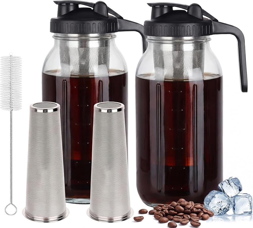 ماكينة تحضير القهوة الباردة، عبوتين سعة 64 أونصة من إبريق ميسون مع زجاج دورابيل وفلتر شبكي من الفولاذ المقاوم للصدأ، وعاء زجاجي مانع للتسرب مع غطاء صنبور الصب