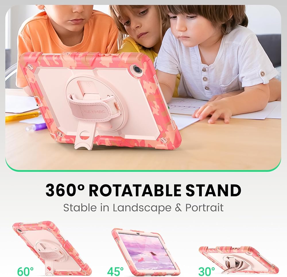 • حامل ومقبض متعدد الاستخدامات: يأتي الجراب مزودًا بحامل ثابت ومقبض دوار 360 درجة، مما يجعل من السهل استخدام الجهاز اللوحي لأي شيء بدءًا من مكالمات الفيديو وحتى مشاهدة الأفلام؛ يوفر الحماية الكاملة لشاشة جهازك اللوحي باستخدام واقي الشاشة المدمج.