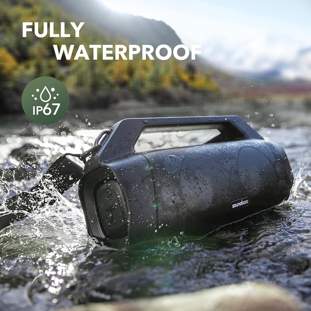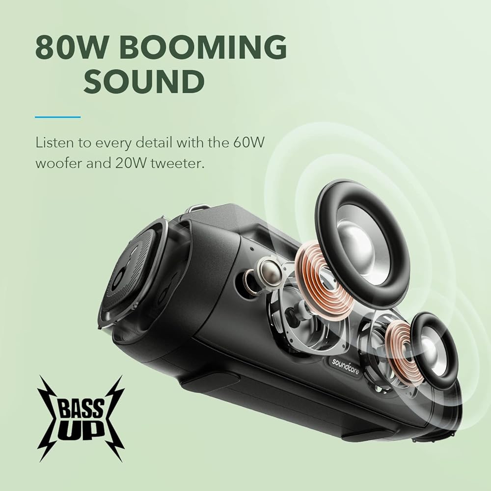 Soundcore Motion Boom Plus من Anker، مكبر صوت محمول IP67، صوت ستيريو 80 وات، EQ & BassUp مخصص، بنك طاقة مدمج، مكبر صوت بلوتوث مقاوم للماء للتخييم والشاطئ والفناء الخلفي