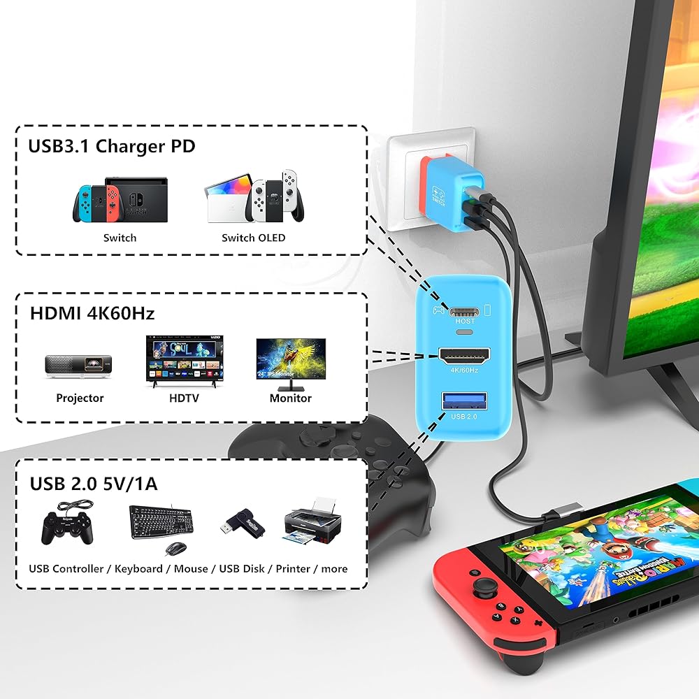 【يدعم شاشة HD 4K@60 هرتز】يدعم محول محطة إرساء التلفزيون Switch دقة تصل إلى 4K@60 هرتز (كحد أقصى). في وضع التلفزيون، يمكنك الاستمتاع بشاشة كبيرة وتجربة ألعاب رسومات عالية الجودة. (مثل: الشاشة والتلفزيون وجهاز العرض.)