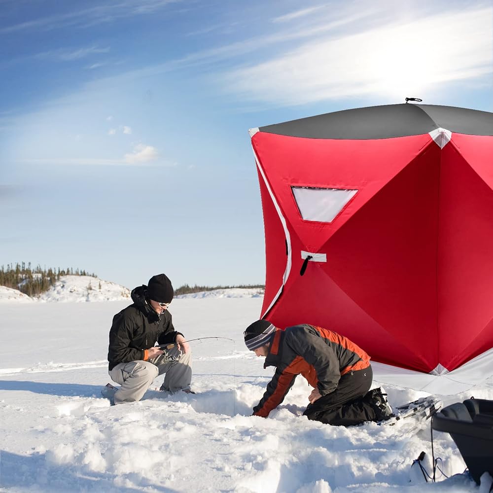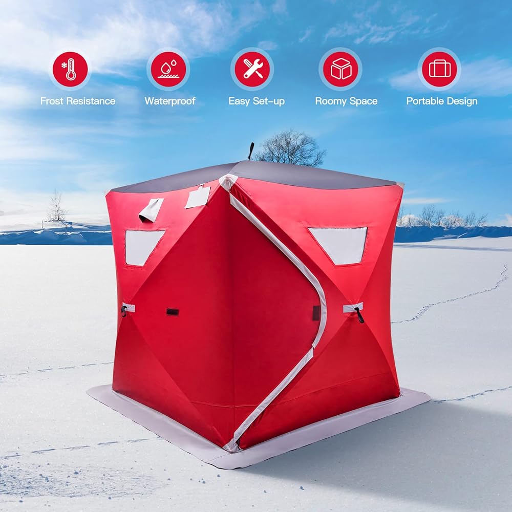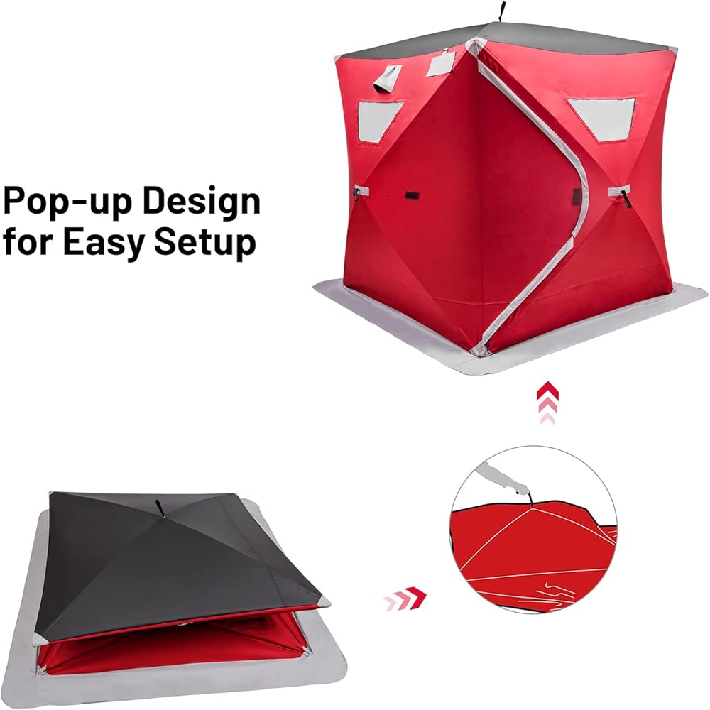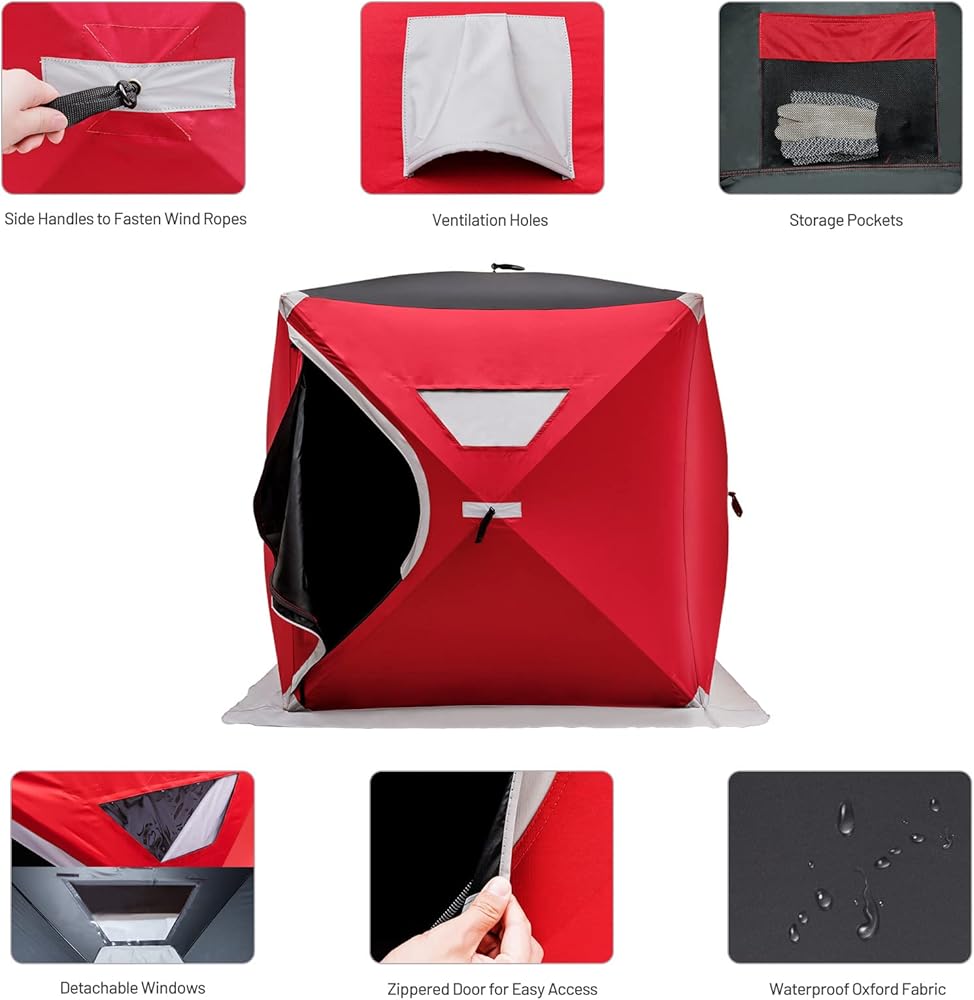 【مادة متينة ومقاومة للماء】خيمة صيد الجليد هذه مصنوعة من قماش أكسفورد 300D مقاوم للاهتراء لتجربة صيد مقاومة للماء في أي طقس. تصميم مقاوم للصقيع بدرجة حرارة أقل من 30 درجة مئوية يحافظ على البرودة في الخارج، مما يسمح لك بالاستمتاع بالأنشطة الخارجية.