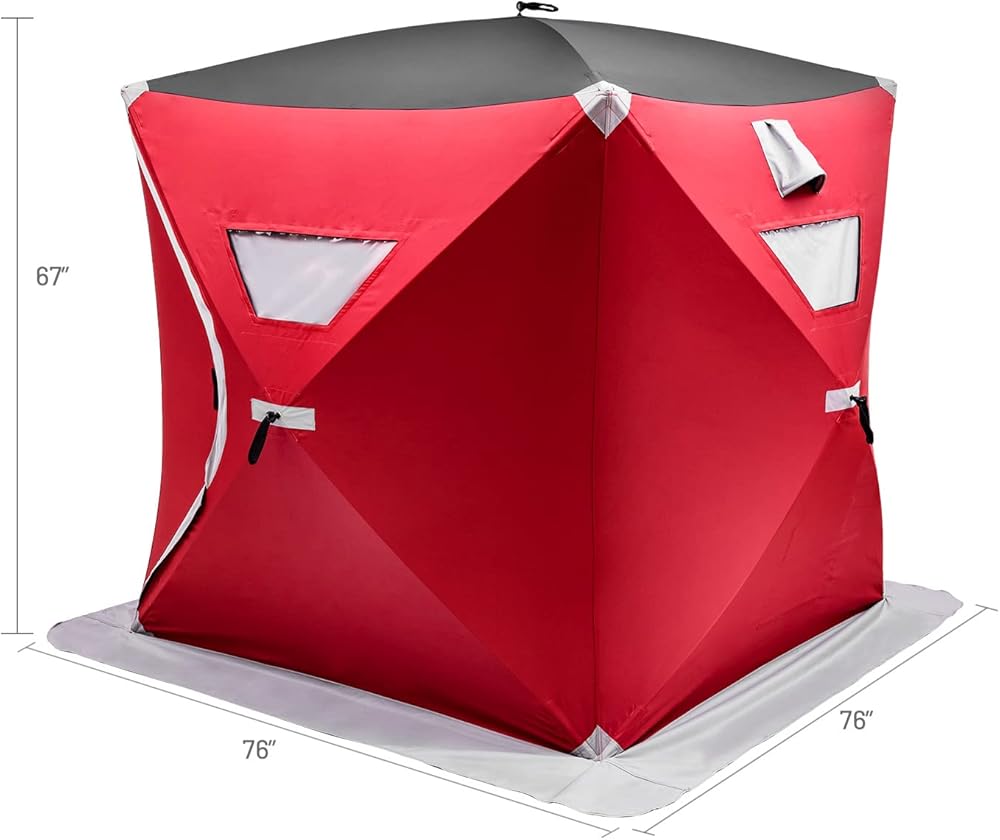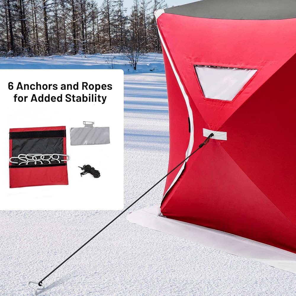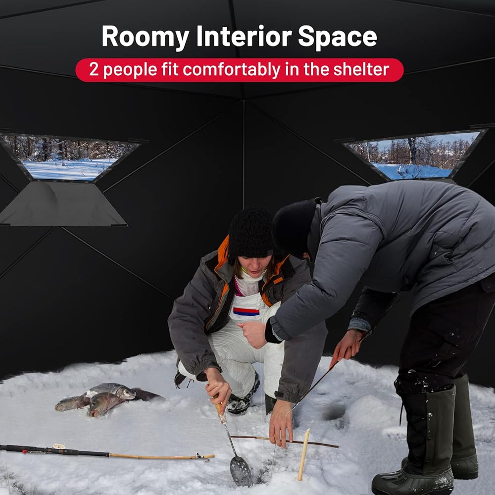 【منطقة واسعة قابلة للصيد】خيمة مأوى ثلجية جميلة وطويلة تمكنك من وضعها بشكل مريح بداخلها دون أي مشكلة، ولا تزال هناك مساحة كافية لوضع مستلزمات الصيد الأخرى. علاوة على ذلك، فإن جيوب التخزين المدمجة تبقي معدات الصيد الأساسية الخاصة بك في متناول يدك.