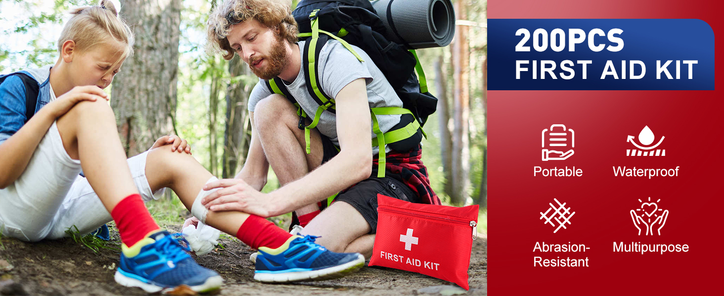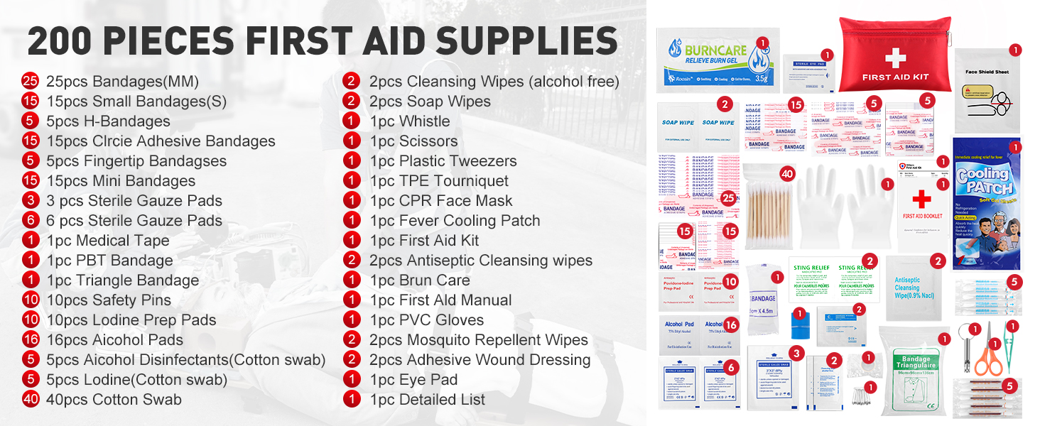 [مجموعة الإسعافات الأولية للعناية الشاملة] : تحتوي مجموعة الإسعافات الأولية للمشي لمسافات طويلة على 200 من أساسيات الإسعافات الأولية عالية الجودة للمساعدة في حالات الجروح والخدوش والحروق والالتواء والحمى وما إلى ذلك. بالإضافة إلى عناصر الإسعافات الأولية الأساسية، تشتمل المجموعة أيضًا على الإنعاش القلبي الرئوي و إرشادات الإسعافات الأولية التي توفر إرشادات واضحة حول استخدام لوازم الإسعافات الأولية.