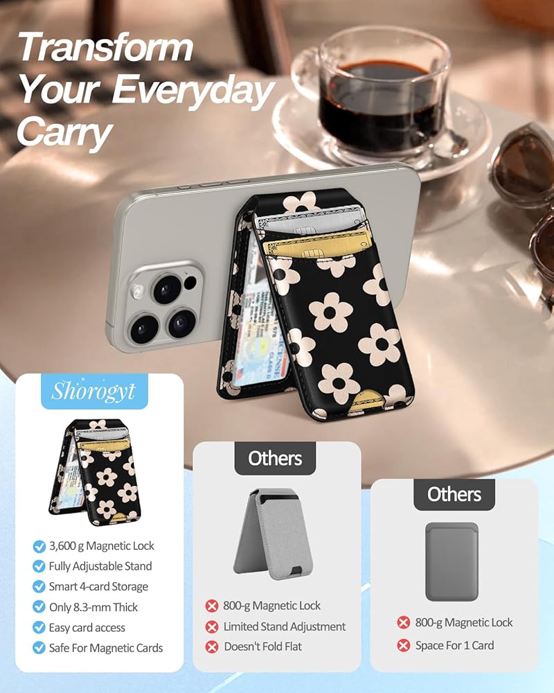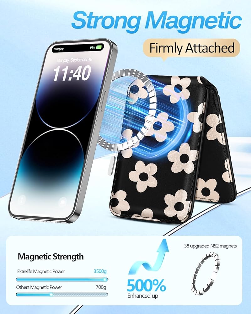 Strong for Magnetic:This for Magnetic wallet is equipped with a powerful magnet inside,which can be tightly attached to the back of your phone.The phone wallet compatible with magsafe is up to 3500Gs,the for Magnetic force is increased by 500% stronger than the other for Magnetic wallet.