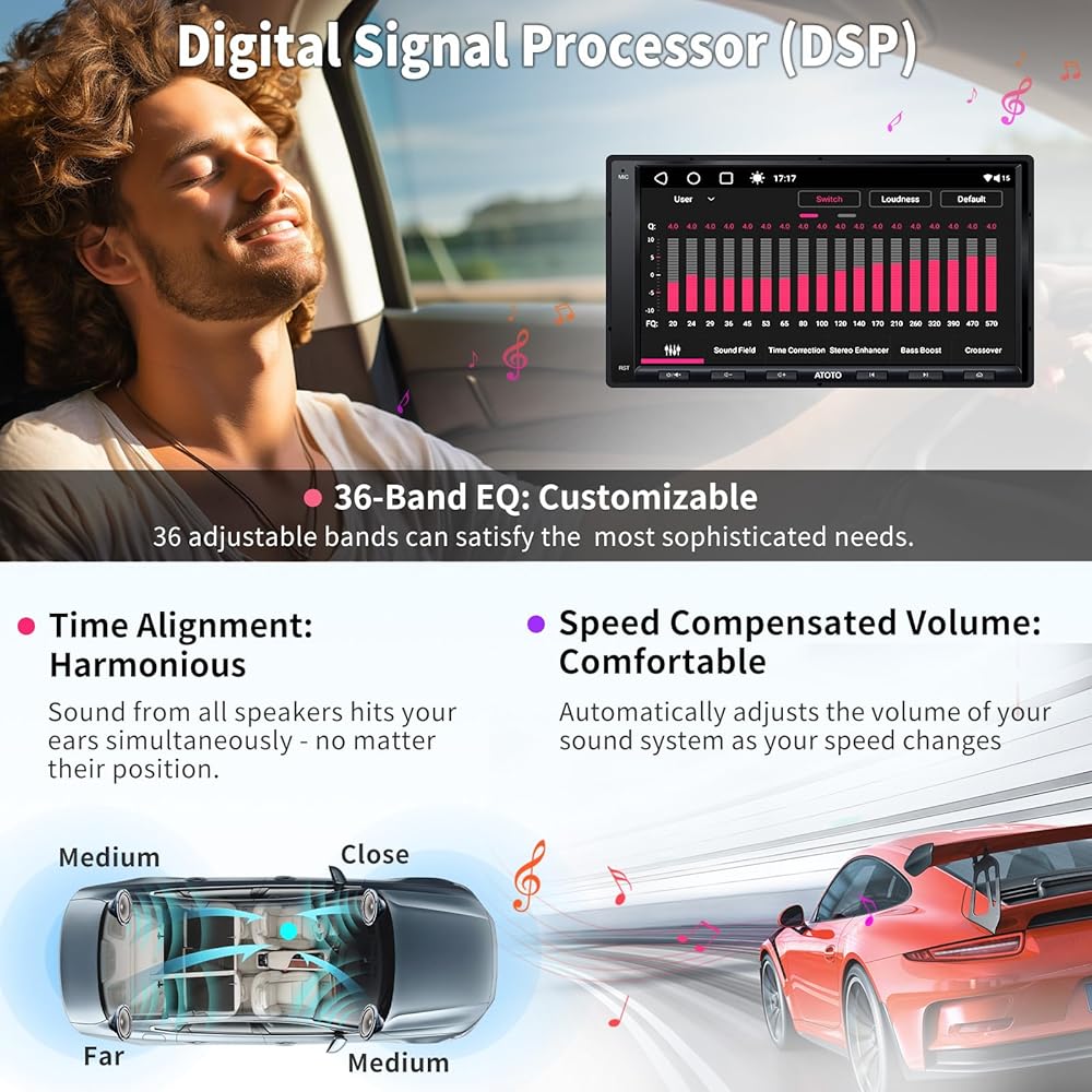 【الصوت النهائي 】 A6 PF's DSP & EQ يحول سيارتك إلى ملاذ صوتي. مع ميزة تصحيح الوقت للحصول على صوت متناغم، ومعادل الصوت ذو 36 نطاقًا للصوت المخصص، وSCVC (التحكم في مستوى الصوت المعوض للسرعة) لمواجهة الضوضاء الخارجية، أنت في انتظار متعة سمعية. يضمن مضخم الصوت المدمج بحد أقصى 4*45 وات و4*24 وات RMS صوتًا قويًا دون تشويه. بالإضافة إلى ذلك، يقوم التقاطع القابل للتعديل بتوجيه ترددات محددة إلى مكبرات الصوت ومكبرات الصوت، مما يمنحك انتقالًا سلسًا وطبيعيًا بين النغمات المنخفضة والعالية.