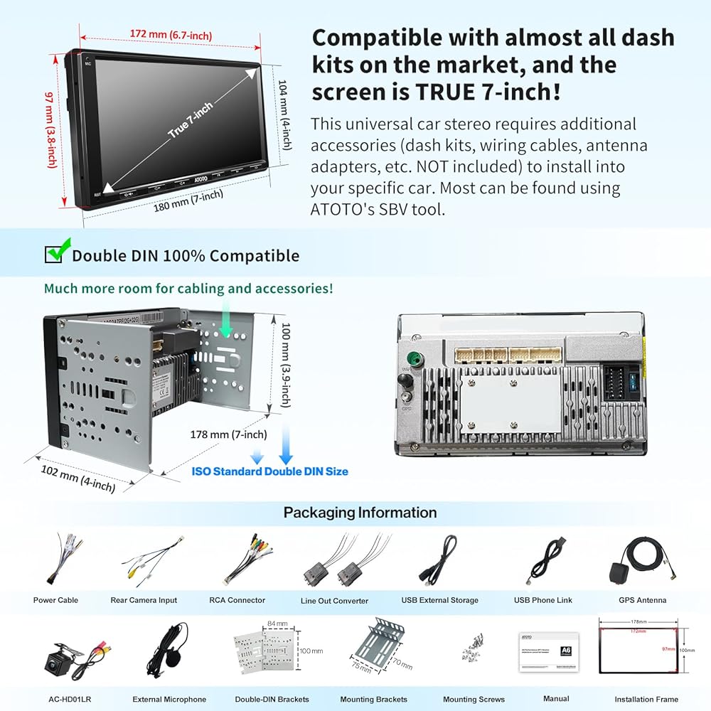 ATOTO A6PF ستيريو سيارة أندرويد مزدوج الدين، راديو سيارة ملاحة 7 بوصة في لوحة القيادة، تشغيل لاسلكي للسيارة، نظام تشغيل أندرويد لاسلكي، تتبع نظام تحديد المواقع العالمي (GPS)، بلوتوث مزدوج، 2G + 32 جيجابايت، HD LRV، كاميرا احتياطية، ميكروفون، A6G2A7PF-S01