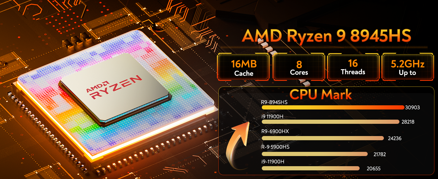 رسومات معالج ممتازة: جهاز كمبيوتر صغير Geekom AE8 مجهز بمعالج AMD Ryzen 9 8945HS مع 8 نوى و16 خيط، 4.0 ~ 5.2 جيجا هرتز، cTDP 45 وات؛ بالإضافة إلى بطاقة رسوميات AMD Radeon 780M بسرعة 2800 ميجا هرتز بتردد 2800 ميجا هرتز و12 نواة. يشتمل الكمبيوتر المحمول الصغير أيضًا على محرك Ryzen AI مع شريحة NPU مدمجة لأداء أعباء عمل الذكاء الاصطناعي المحلية دون الاعتماد على الشبكة أو السحابة، مما يجعل عملية الإنشاء أكثر ذكاءً وبساطة