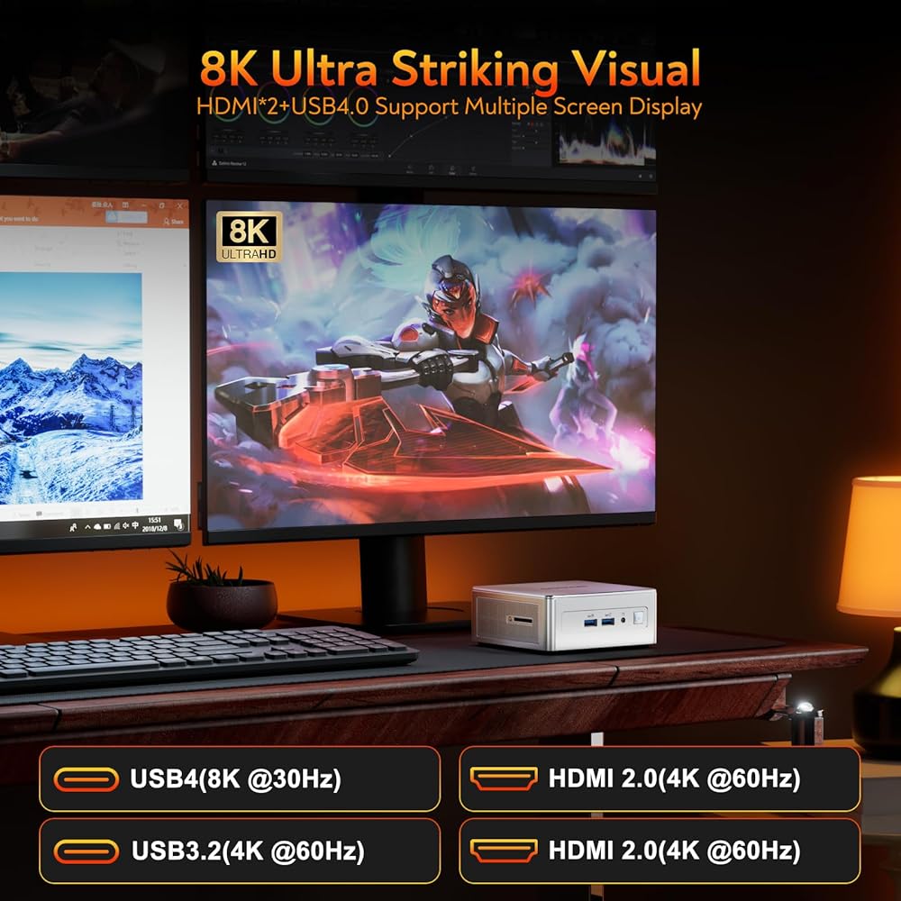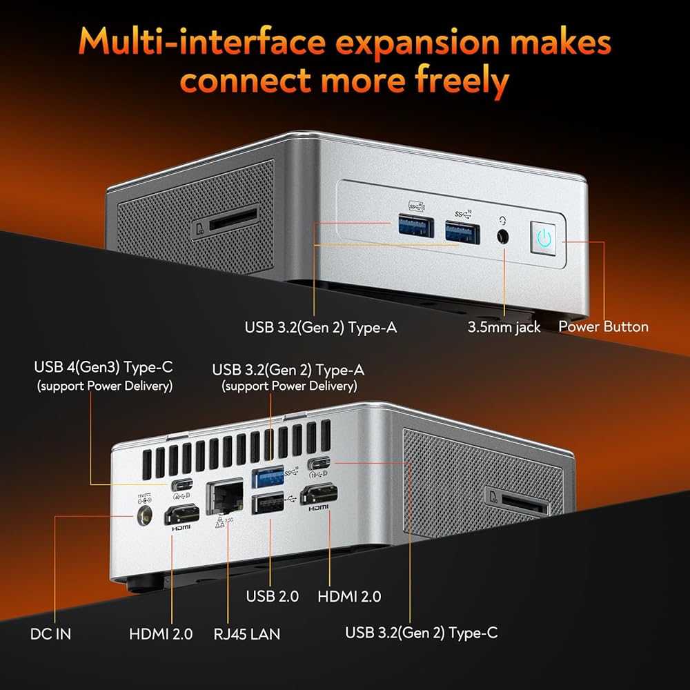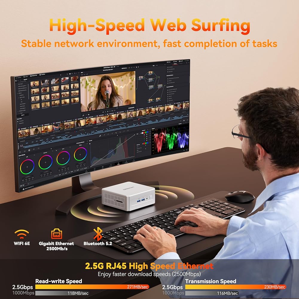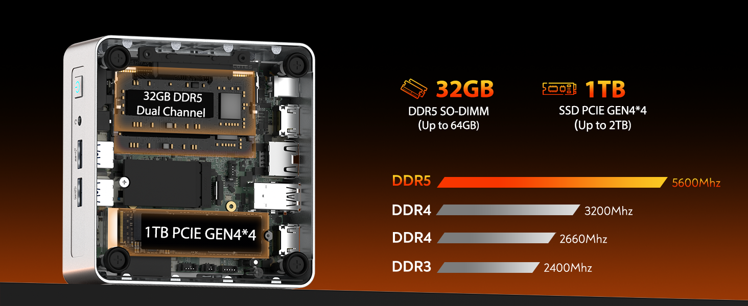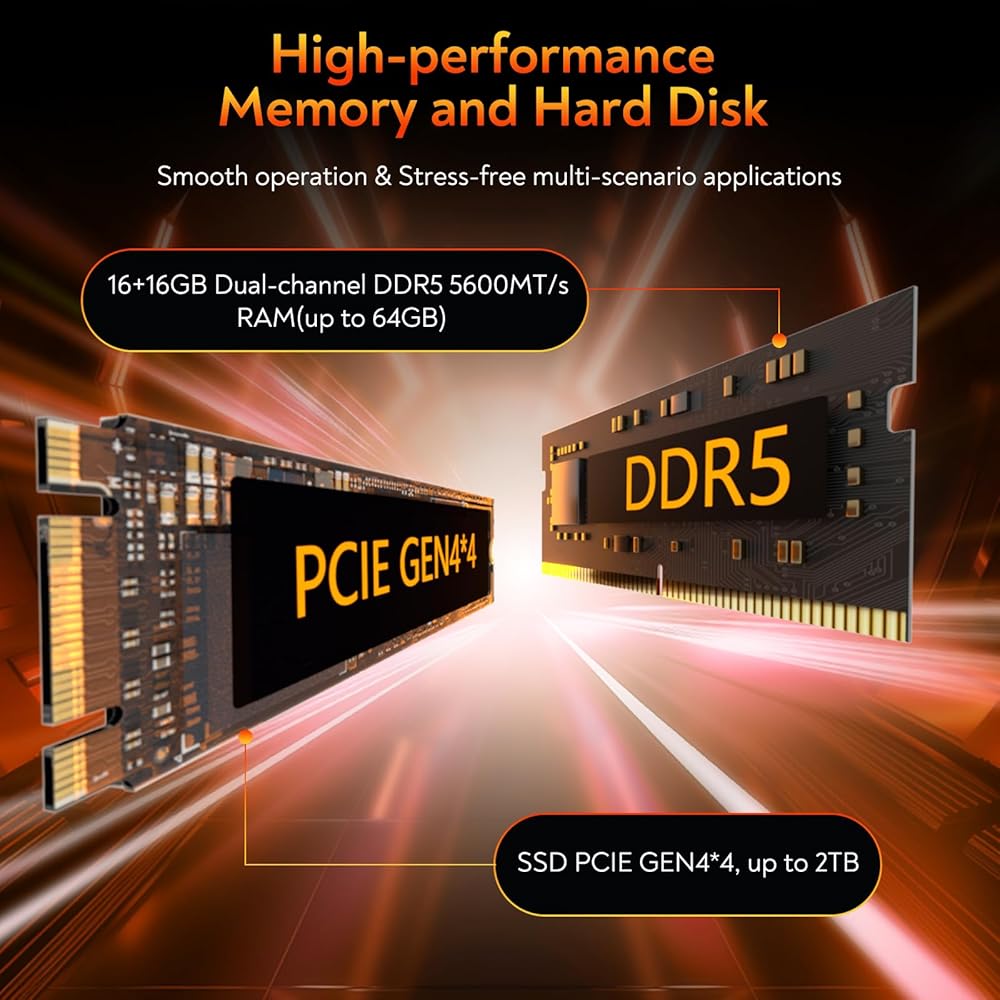 ذاكرة كافية: يأتي الكمبيوتر الصغير مزودًا بذاكرة DDR5 5600MT/s ثنائية القناة سعة 32 جيجابايت (قابلة للتوسيع حتى 64 جيجابايت)، و1 تيرابايت M.2 2280 PCIe Gen4x4.0 SSD (قابلة للتوسيع حتى 2 تيرابايت، ومتوافق مع الإصدارات السابقة مع محركات أقراص الحالة الصلبة Gen3، وغير متوافق مع محركات أقراص SATAIII SSD). تم تجهيز جهاز الكمبيوتر الصغير ryzen ببطاقة واجهة شبكة WiFi6E قابلة للفصل لنطاقات 2.4 جيجا هرتز و5 جيجا هرتز و6 جيجا هرتز وBluetooth 5.2 لاتصال أسرع وأكثر استقرارًا بسماعات الرأس ولوحات المفاتيح والأجهزة الأخرى مثل الشاشات والطابعات.