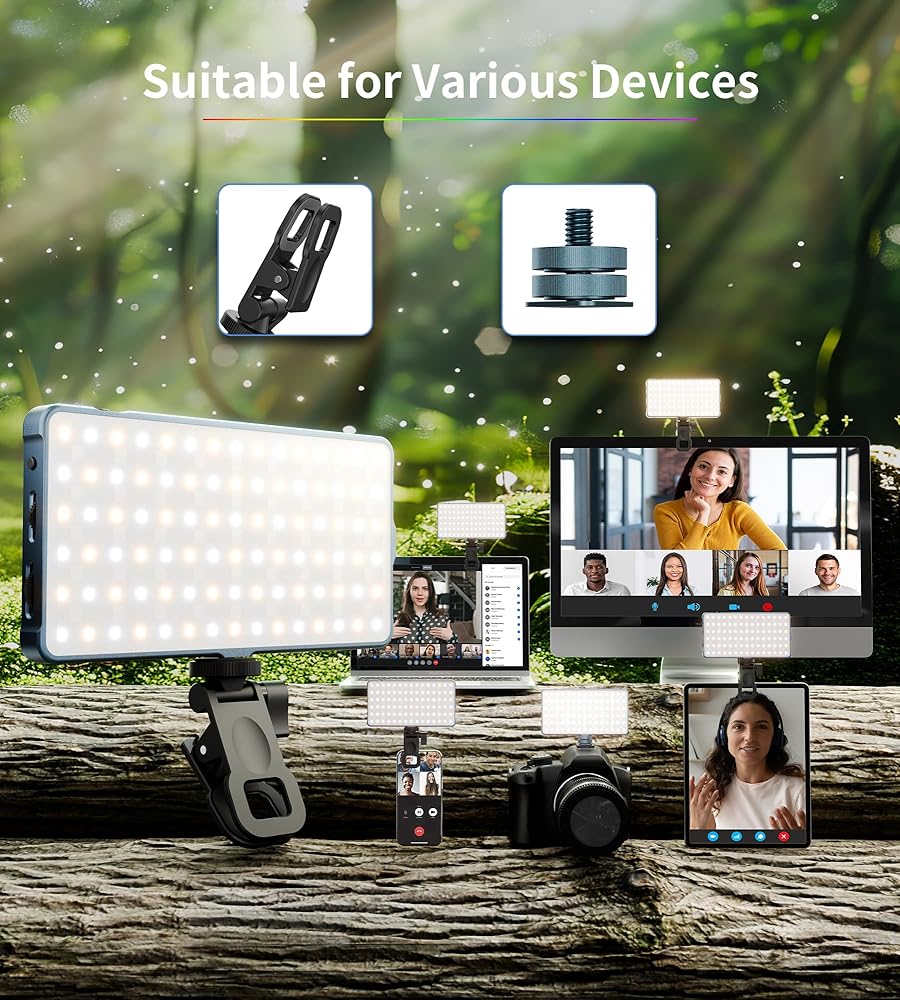 【توافق واسع وسيناريوهات استخدام متعددة】مصباح سيلفي RGB متوافق مع 99% من الهواتف الذكية وأجهزة الكمبيوتر المحمولة وأجهزة IPad وما إلى ذلك. يأتي مع حذاء معدني ساخن يتم ربطه بالكاميرا، مثالي لـ TikTok وYouTube وInstagram والمزيد. ضوء السيلفي الخاص بالآيفون، يمكنك استخدامه للسيلفي أو البث المباشر أو التصوير الفوتوغرافي أو المكياج، لحل مشكلة الإضاءة المنخفضة ويمنحك تجربة أفضل