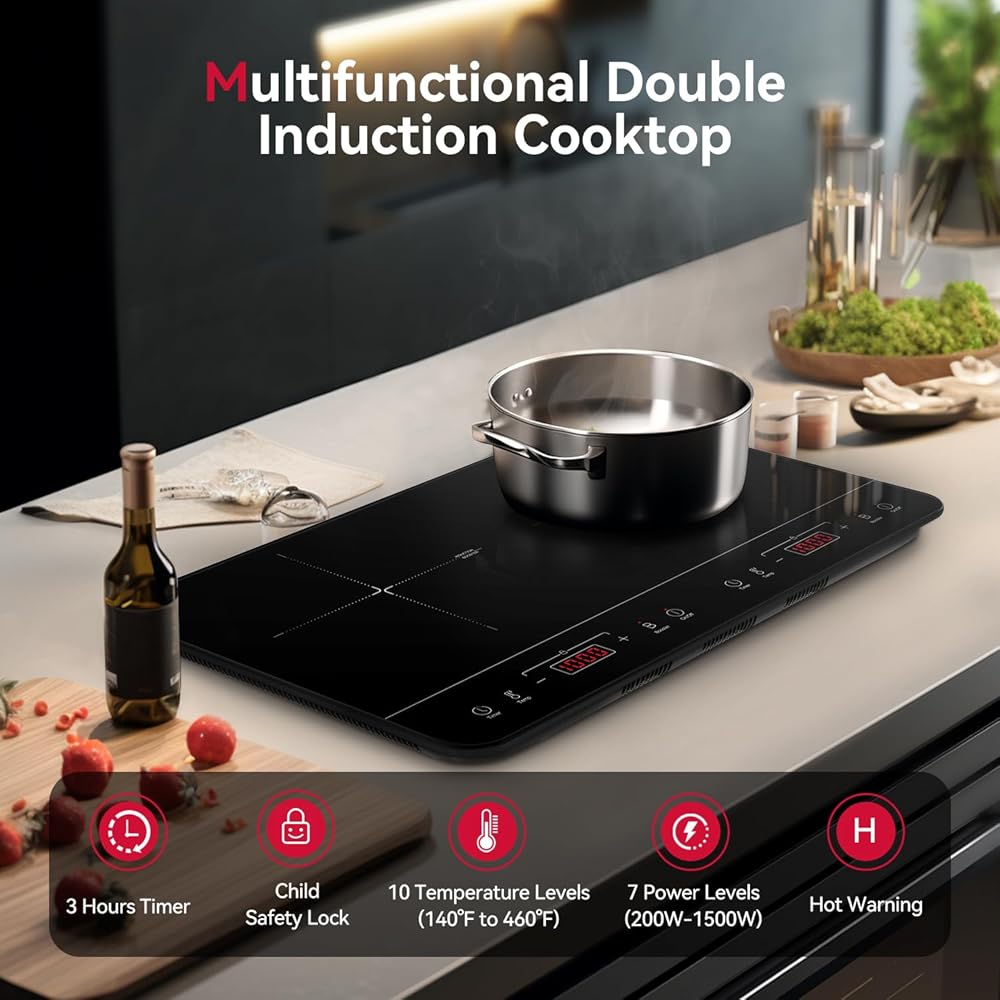 【وضعان مناسبان للطهي】مجهز بـ 10 مستويات لدرجة الحرارة من 140-464 درجة فهرنهايت و7 مستويات طاقة من 200-1500 وات، يتيح لك الموقد ذو الحث المزدوج اختيار أي وضع مناسب للتحكم في مستوى الحرارة لتلبية احتياجات الطبخ المختلفة. مثل التبخير، والسلق، والمقلي، والقلي، والطهي البطيء.