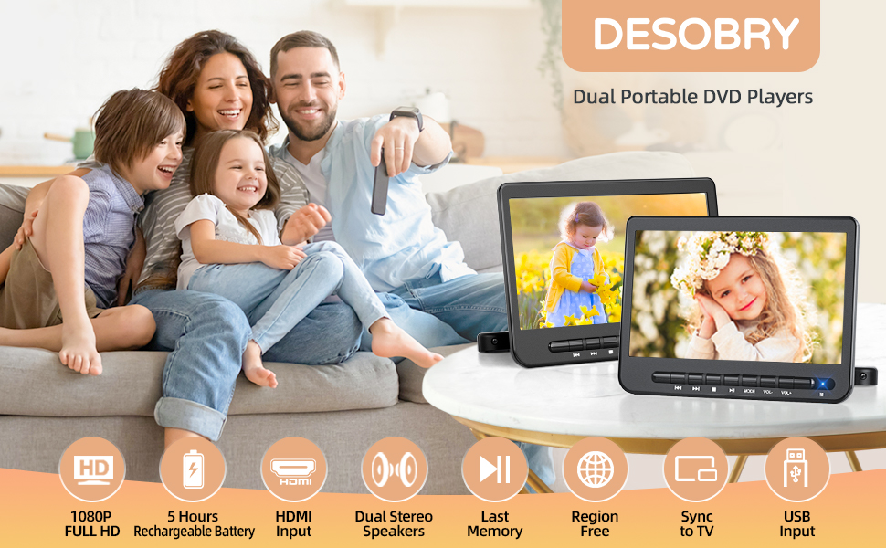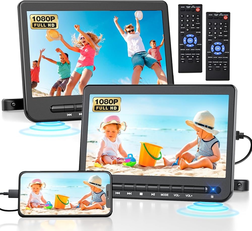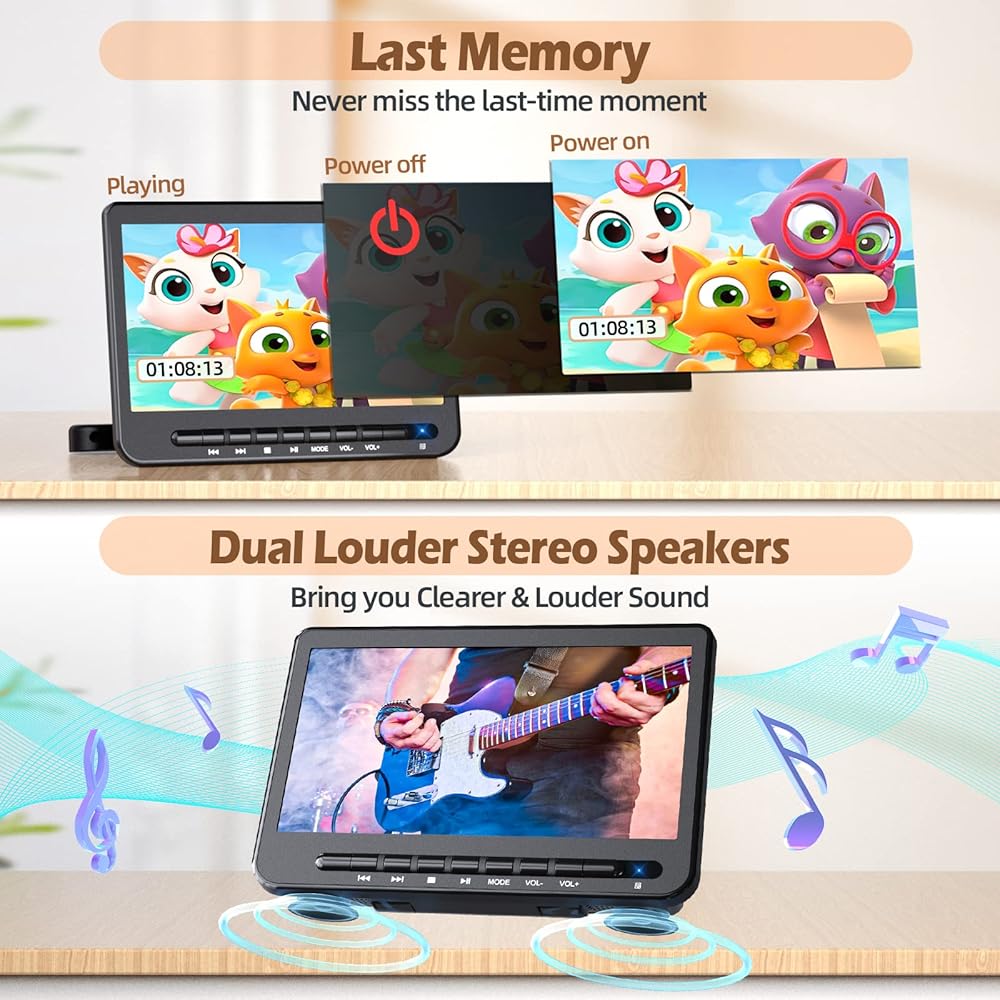 مشغل DVD محمول مقاس 10.51 بوصة من DESOBRY للسيارة بشاشة مزدوجة 1080P Full HD مع دعامة تثبيت، ومشغل DVD للسيارة يشغل نفس الأفلام أو أفلام مختلفة، بطارية 5 ساعات، تلفزيون متزامن، يدعم بطاقة USB/SD، الذاكرة الأخيرة