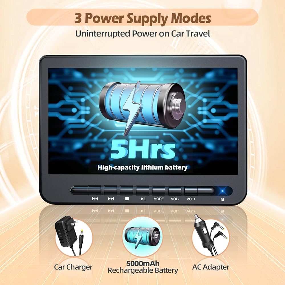 ⚡【3 أوضاع طاقة】بطارية ليثيوم مدمجة قابلة لإعادة الشحن بقدرة 5000 مللي أمبير في الساعة، يضمن مشغل DVD المزدوج للسيارة DESOBRY للأطفال 5 ساعات من تشغيل الفيديو، وستعمل كلتا الشاشتين لمدة 2.5-3 ساعات عند توصيلهما معًا. لذا يمكنك مشاهدة الأفلام في أي وقت وفي أي مكان دون القلق بشأن نفاد الطاقة. ثلاثة مصادر طاقة - بطارية مدمجة، وشاحن سيارة، ومحول تيار متردد، مما يجعلك خاليًا من القلق أثناء التنقل!