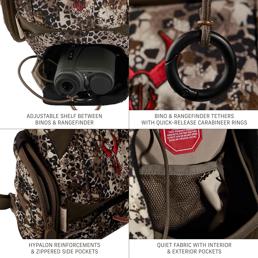 Advanced Organization - Designated compartments for binos and rangefinder; Interior shelf adjusts to accommodate different sizes of binoculars; External storage pocket is perfect for your wind check or pocketknife