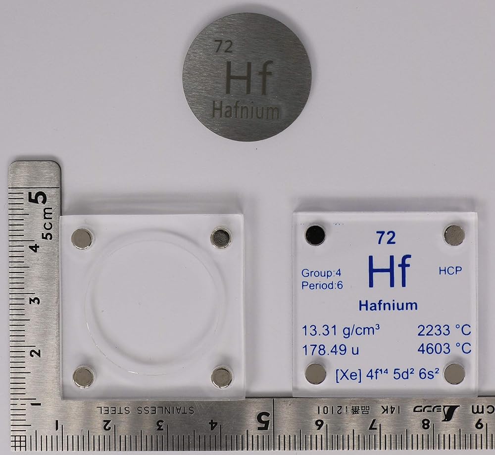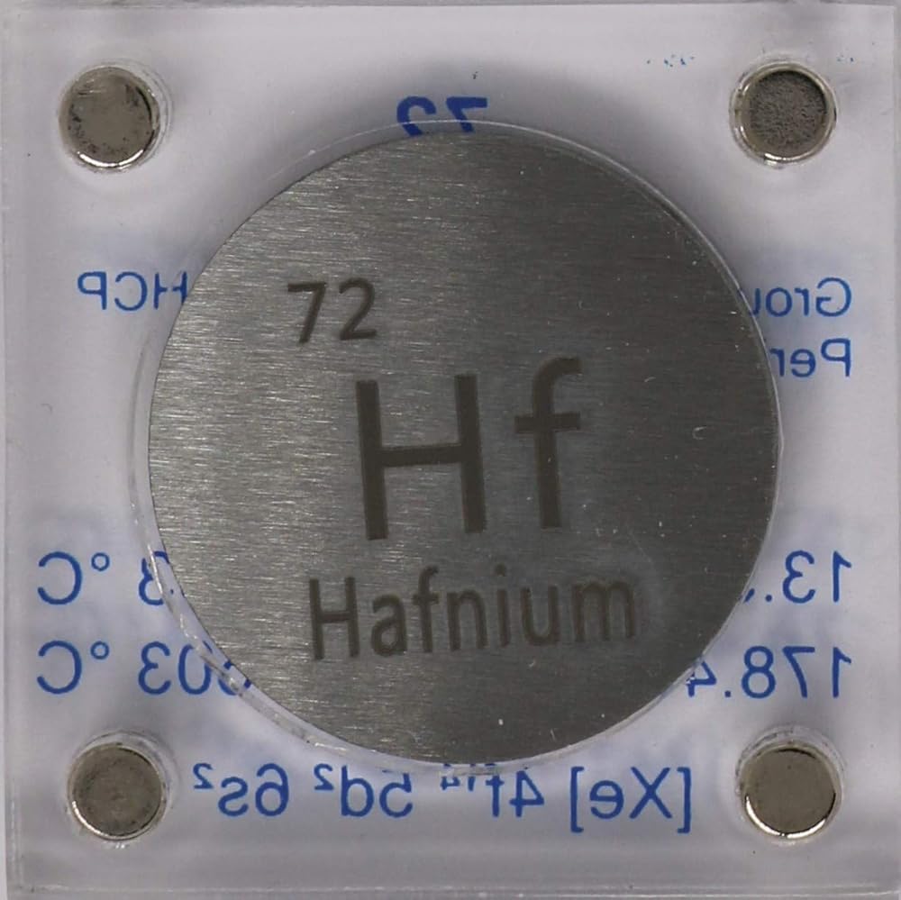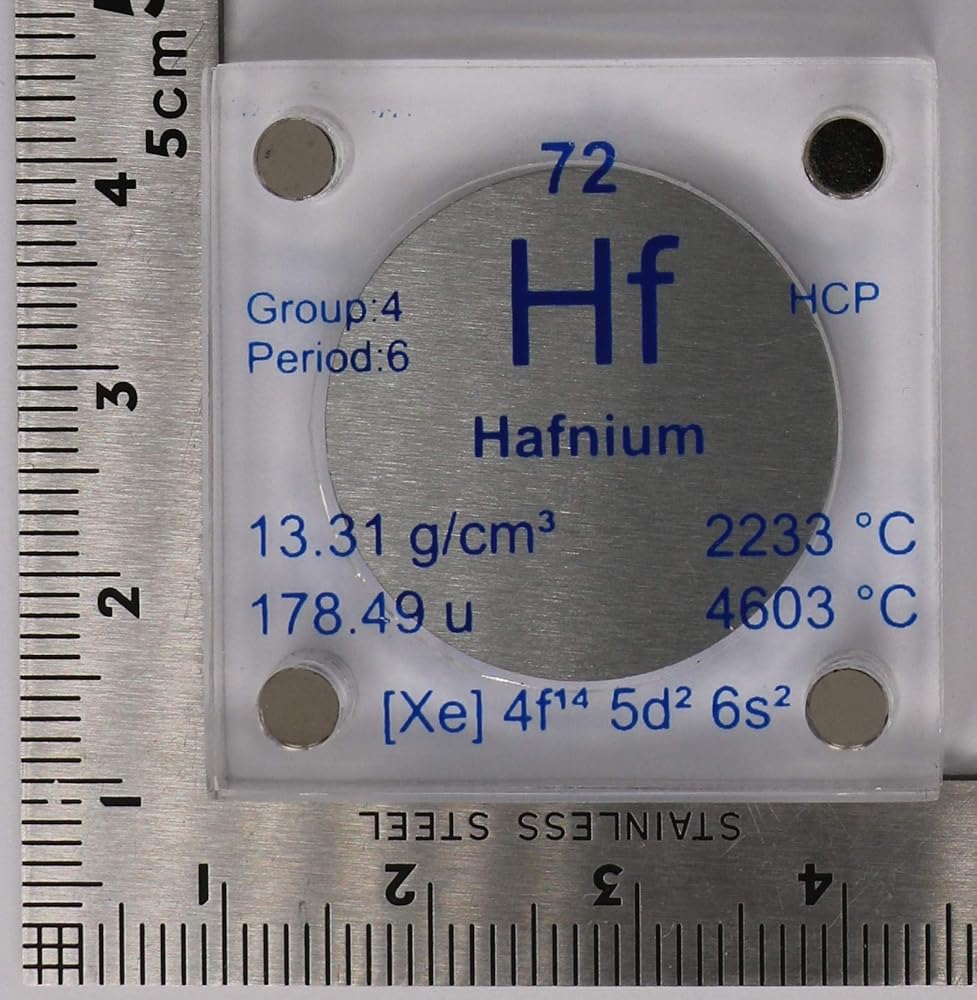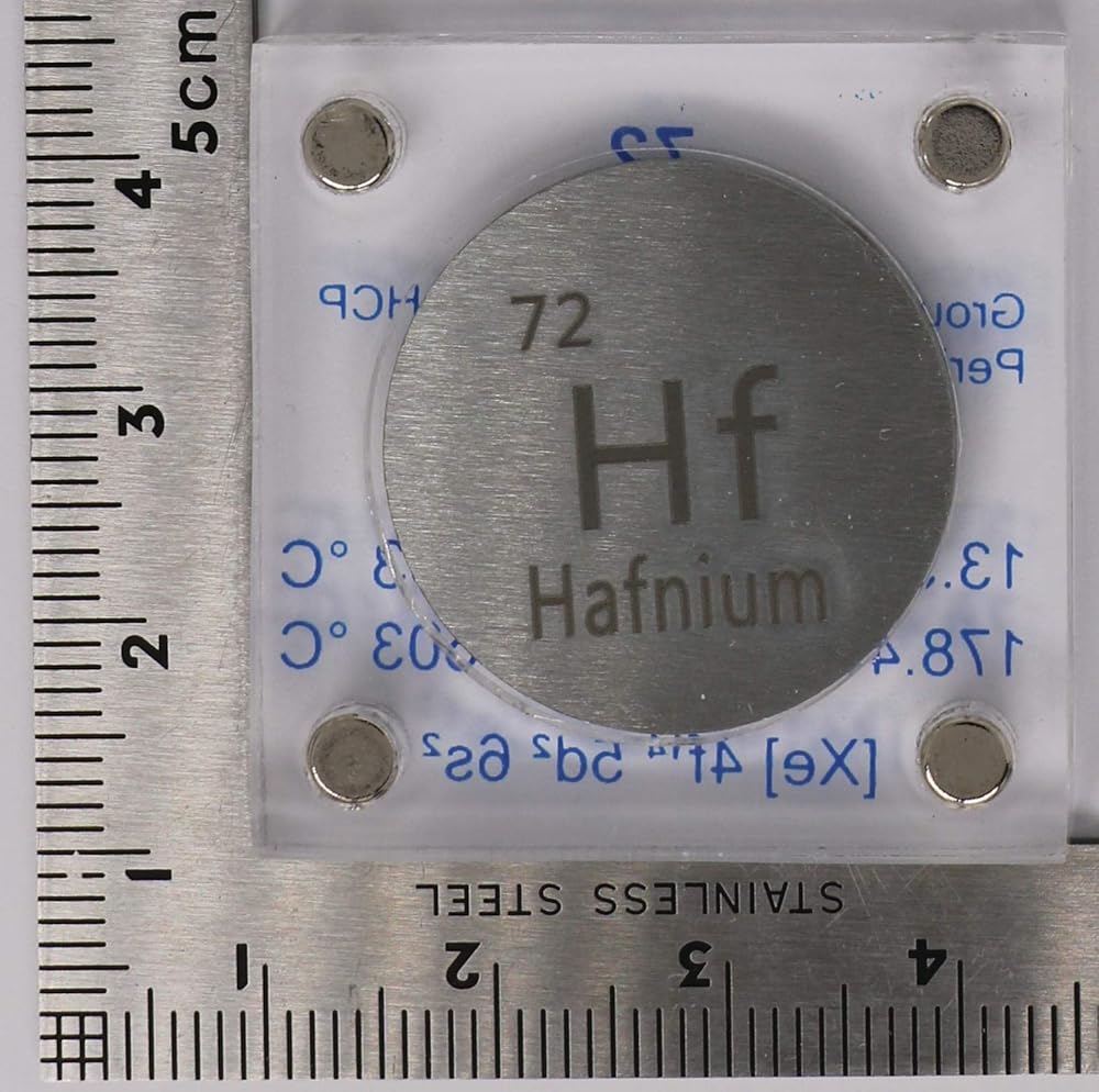 Hafnium is a chemical element with the symbol Hf and atomic number 72. A lustrous, silvery gray, tetravalent transition metal, hafnium chemically resembles zirconium and is found in many zirconium minerals. -Wikipedia Quarter and scale not included