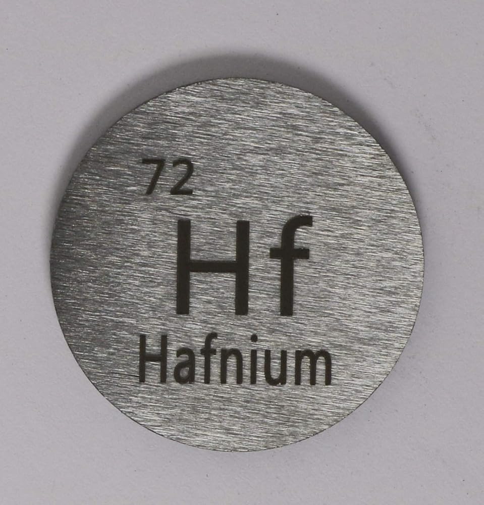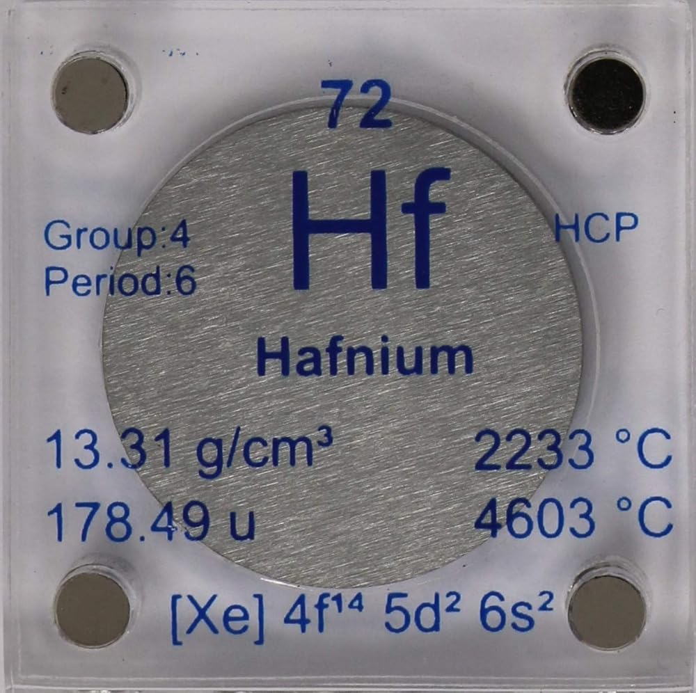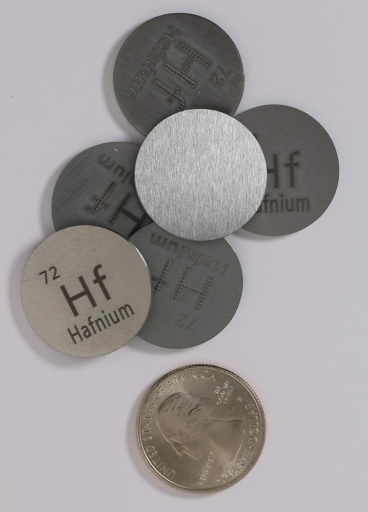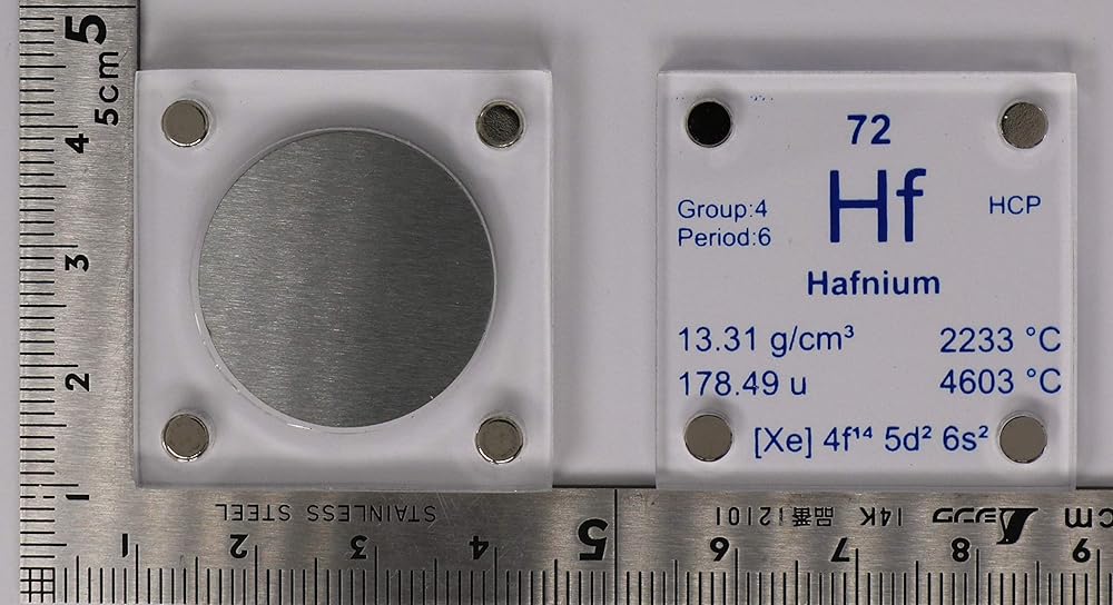 Hafnium is a chemical element with the symbol Hf and atomic number 72. A lustrous, silvery gray, tetravalent transition metal, hafnium chemically resembles zirconium and is found in many zirconium minerals. -Wikipedia Quarter and scale not included