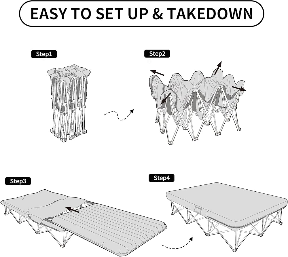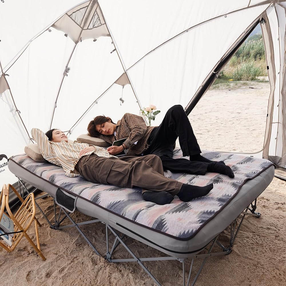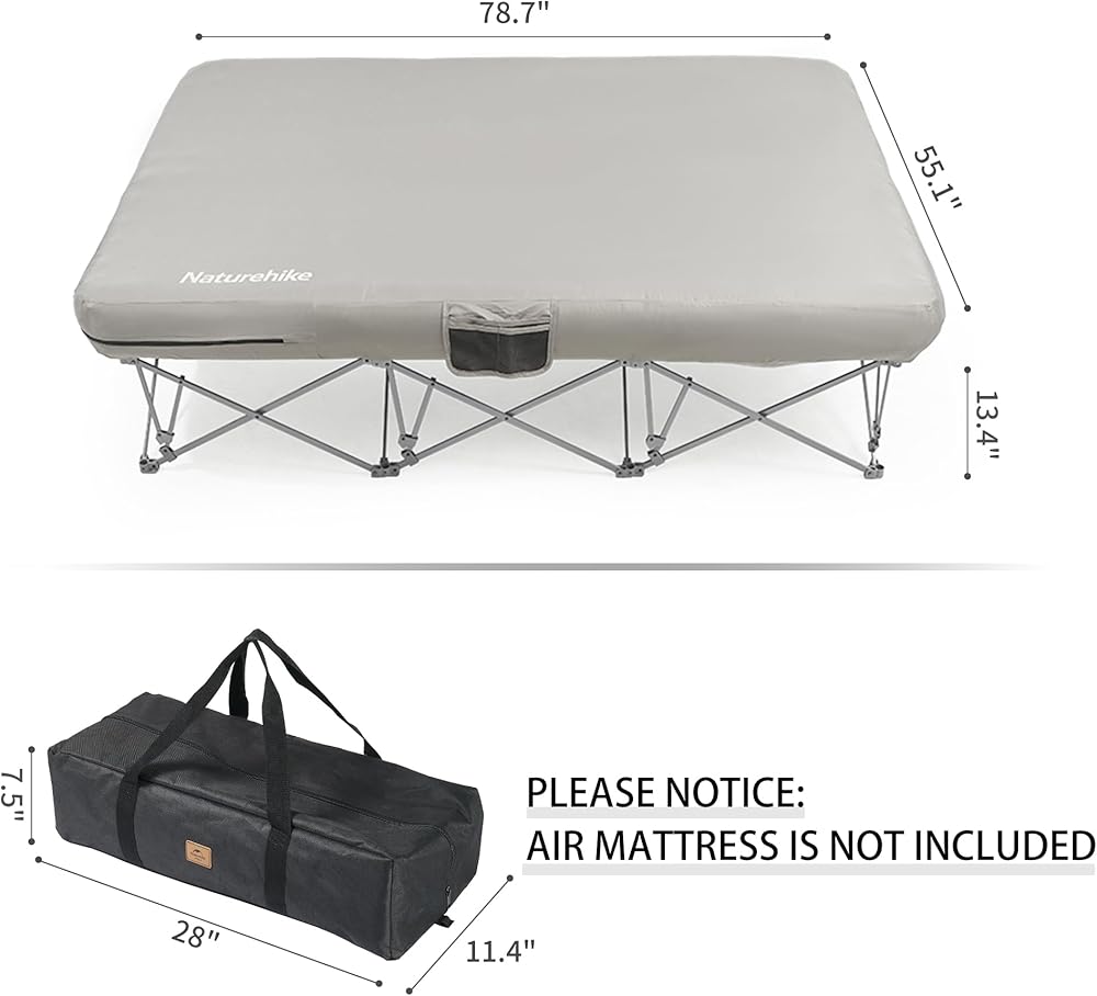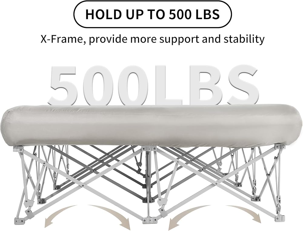 [مثالي لشخصين] يبلغ حجم سرير التخييم القابل للطي بالحجم الكامل مع مرتبة هوائية 78.7 بوصة طولًا × 55.1 بوصة عرضًا × 13.4 بوصة ارتفاعًا. يوفر الإطار X عالي التحمل مزيدًا من الدعم والثبات، ويتحمل ما يصل إلى 500 رطل.