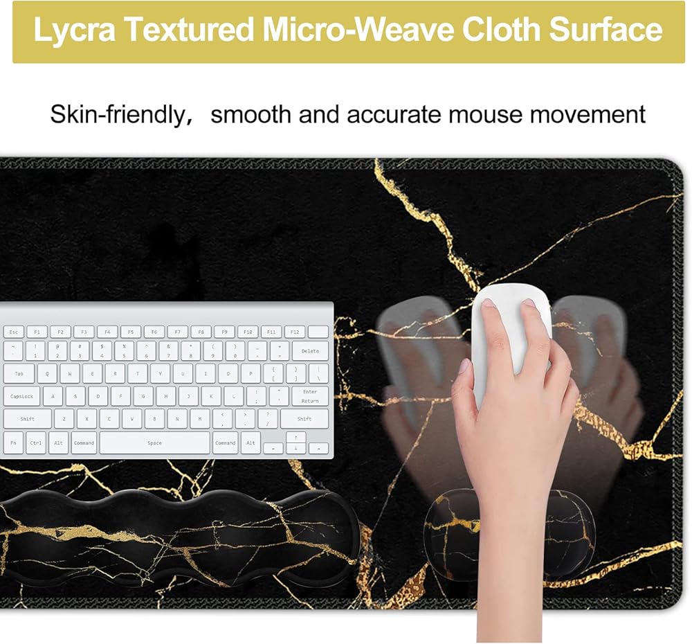 تصميم مريح: لوحة ماوس مريحة مع دعم المعصم تناسب المعصم تمامًا، ويمكن لمسند معصم لوحة المفاتيح ومسند معصم الماوس توفير لمسة جيدة ودعم فعال لمعصمك، وتقليل الضغط الناتج عن استخدام الكمبيوتر والمكتب لفترة طويلة من عدم الراحة في المعصم والألم
