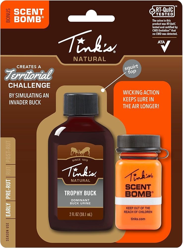 Features Trophy Buck Lure containing 100 percent natural rutting buck urine. Induces a territorial challenge to another buck and provokes him to seek out the intruder. Excellent for use when rattling or grunting. Also works in the early season as a curiousity scent. Includes Tink's Scent Bomb for easy scent dispersal.