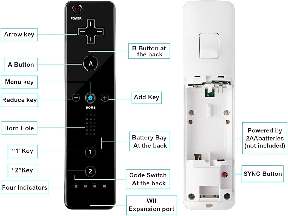 مزامنة سهلة: 1. قم بتحميل بطاريتين AA 1.5 فولت (البطاريات غير متضمنة). 2. اضغط على الزر الأحمر الموجود في الجزء الخلفي من وحدة تحكم wii وزر "SYNC" الموجود على وحدة التحكم بشكل منفصل. 3. إذا فشل الاتصال، فأنت بحاجة أولاً إلى الضغط على زر "SYNC" الموجود على وحدة التحكم لمدة 15 ثانية لمسح جميع وحدات التحكم المتصلة. 4. ثم اضغط على وحدة تحكم wii وزر "SYNC" الموجود على وحدة التحكم ووحدة التحكم wii على التوالي. (المنتج لا يشمل البطاريات)