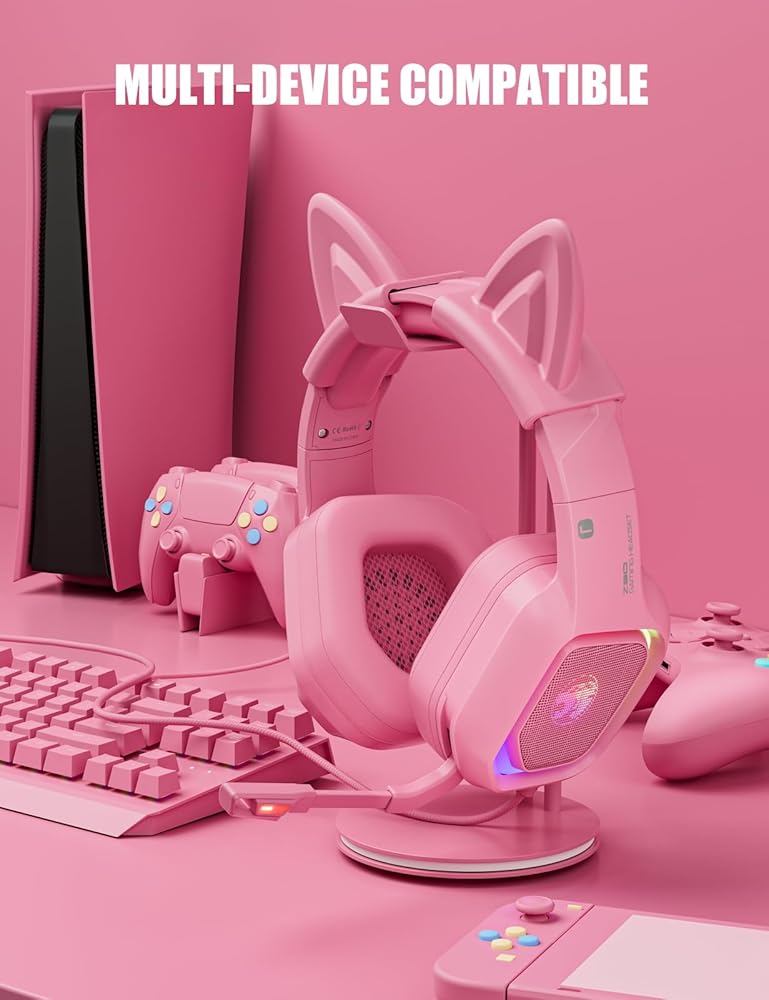 سماعة ألعاب ZIUMIER مع آذان قطة قابلة للفصل، متوافقة مع جهاز الكمبيوتر المحمول PS4 PS5 Xbox One PC، وسماعات رأس فوق الأذن مع ضوء LED، وميكروفون لإلغاء الضوضاء، وصوت محيطي ستيريو (القطة الوردية)