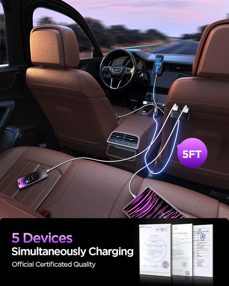 شاحن USB للسيارة 5 في 1 متعدد المنافذ، محول شاحن هاتف السيارة 12 فولت لأجهزة متعددة، شاحن USB ولاعة سجائر السيارة مع كابل تمديد 5 أقدام لشحن المقعد الخلفي