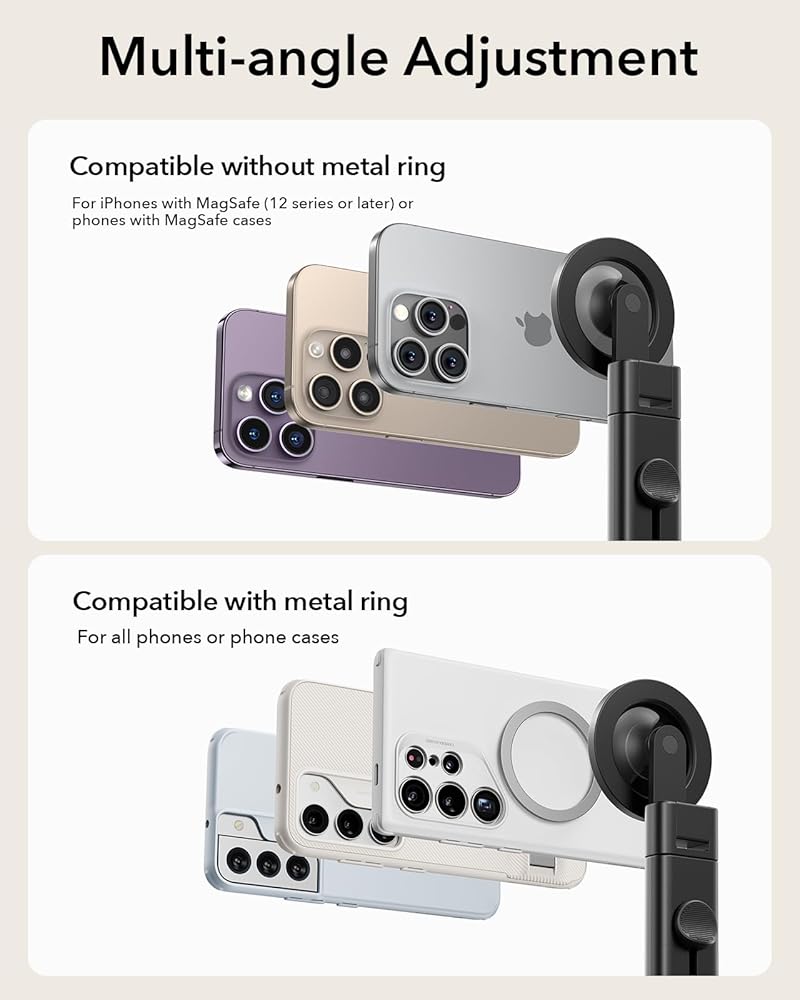 متوافق مع جميع موديلات الهواتف: يدعم iPhone MagSafe ويتضمن حلقتين مغناطيسيتين؛ يتوافق حامل الهاتف الخلوي هذا مع سلسلة iPhone 16/15/14/13/12 وحافظات الهاتف المتوافقة مع MagSafe؛ متوافق أيضًا مع الهواتف غير التابعة لـ MagSafe وحافظات الهواتف غير التابعة لـ MagSafe باستخدام الحلقات المغناطيسية المضمنة، مثل سلسلة iPhone 11/X/8 وسلسلة Samsung Galaxy S24/S23/S22/S21 وهواتف Google Pixel والمزيد.