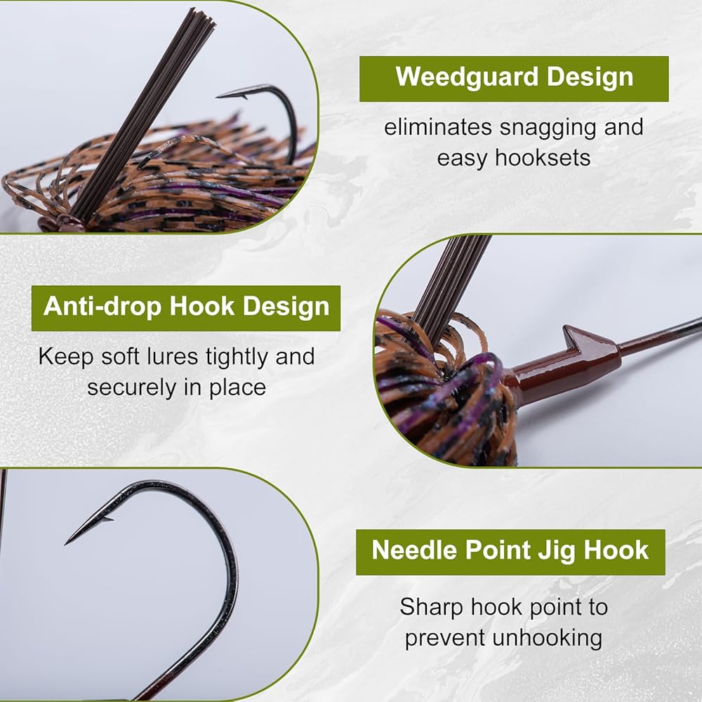 خطاف شائك حاد للغاية: مزود بخطاف حاد من الفولاذ عالي الكربون، يتميز هذا الخطاف بنقطة خطاف حادة، وقابلية اختراق قوية، ومتانة عالية، ويتفوق على الخطافات العادية. حافظة الطعم المدمجة، ستحتفظ أدوات الصيد هذه بالطعم البلاستيكي الناعم بقوة، مما يسمح للطعم الناعم بأن يتناسب بشكل أقرب مع رأس الطعم.