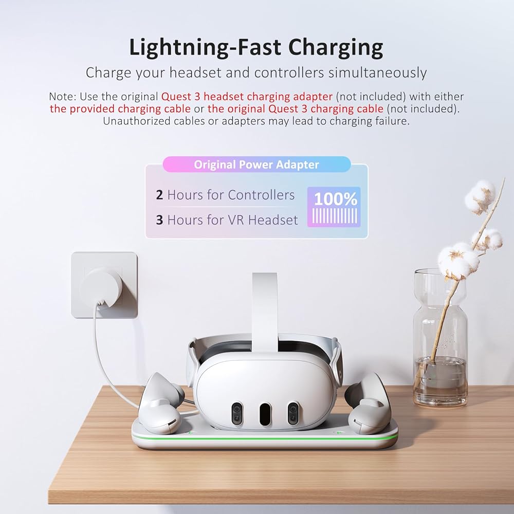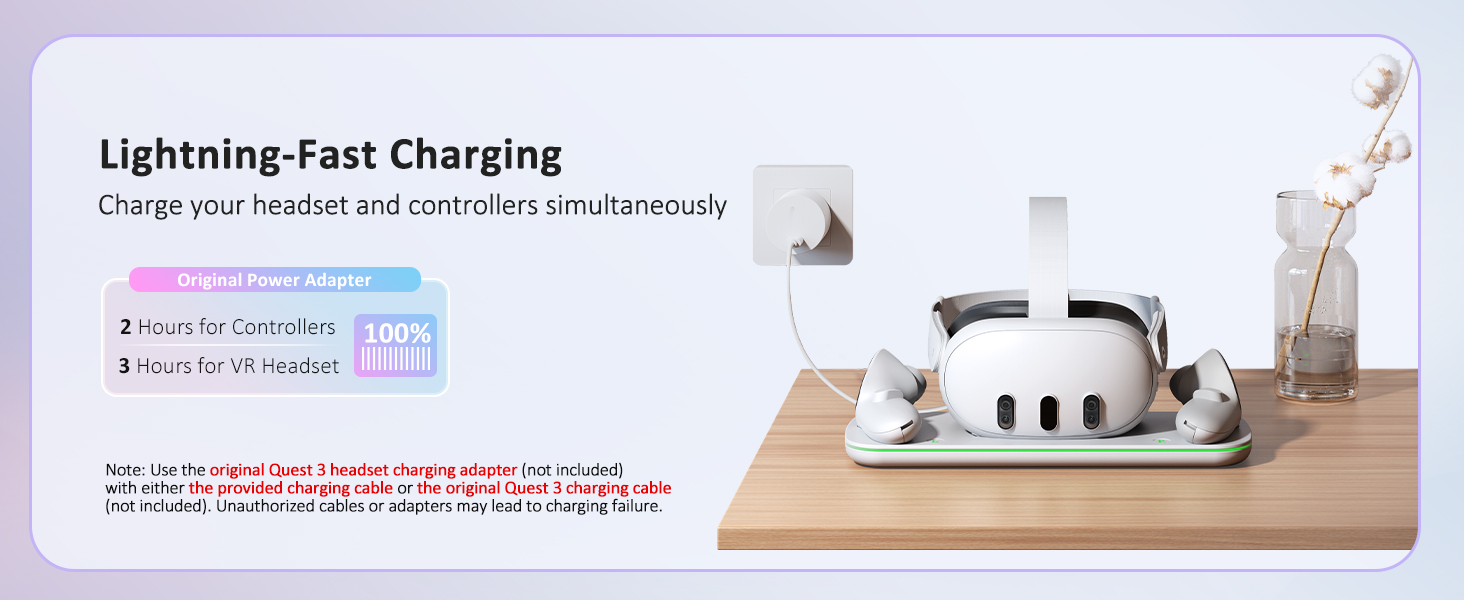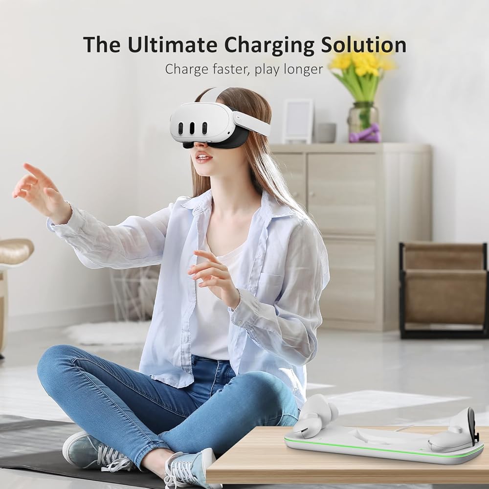 • 【شحن سريع】تسمح لك محطة شحن الواقع الافتراضي لـ Quest 3 بشحن سماعات الرأس وأجهزة التحكم التي تعمل باللمس في نفس الوقت. اشحن سماعة الرأس ووحدات التحكم باللمس بالكامل خلال 3.5 ساعة تقريبًا. يأتي مزودًا بكابل USB-C، مما يضمن الاتصال بسهولة بمجموعة واسعة من أجهزة الطاقة. (ملاحظة: قم بتحسين نتائج الشحن الأفضل باستخدام شاحن الواقع الافتراضي الأصلي.)